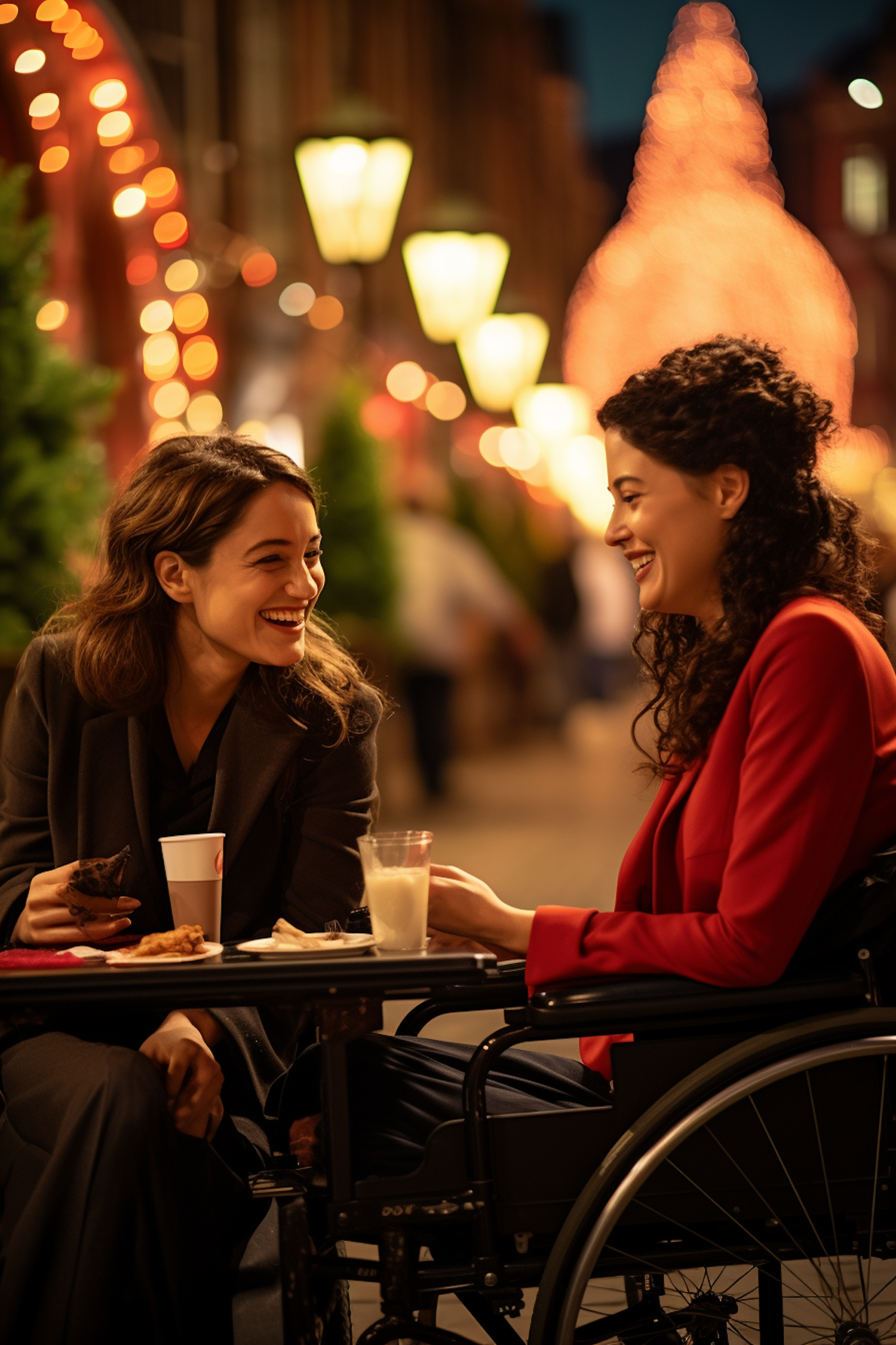 Two women enjoying a lively conversation at a festive outdoor café, surrounded by warm lights and a joyful atmosphere.