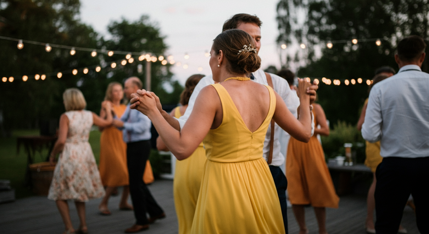 A lively outdoor evening dance with string lights, featuring a woman in a yellow dress and others enjoying the festive atmosphere.
