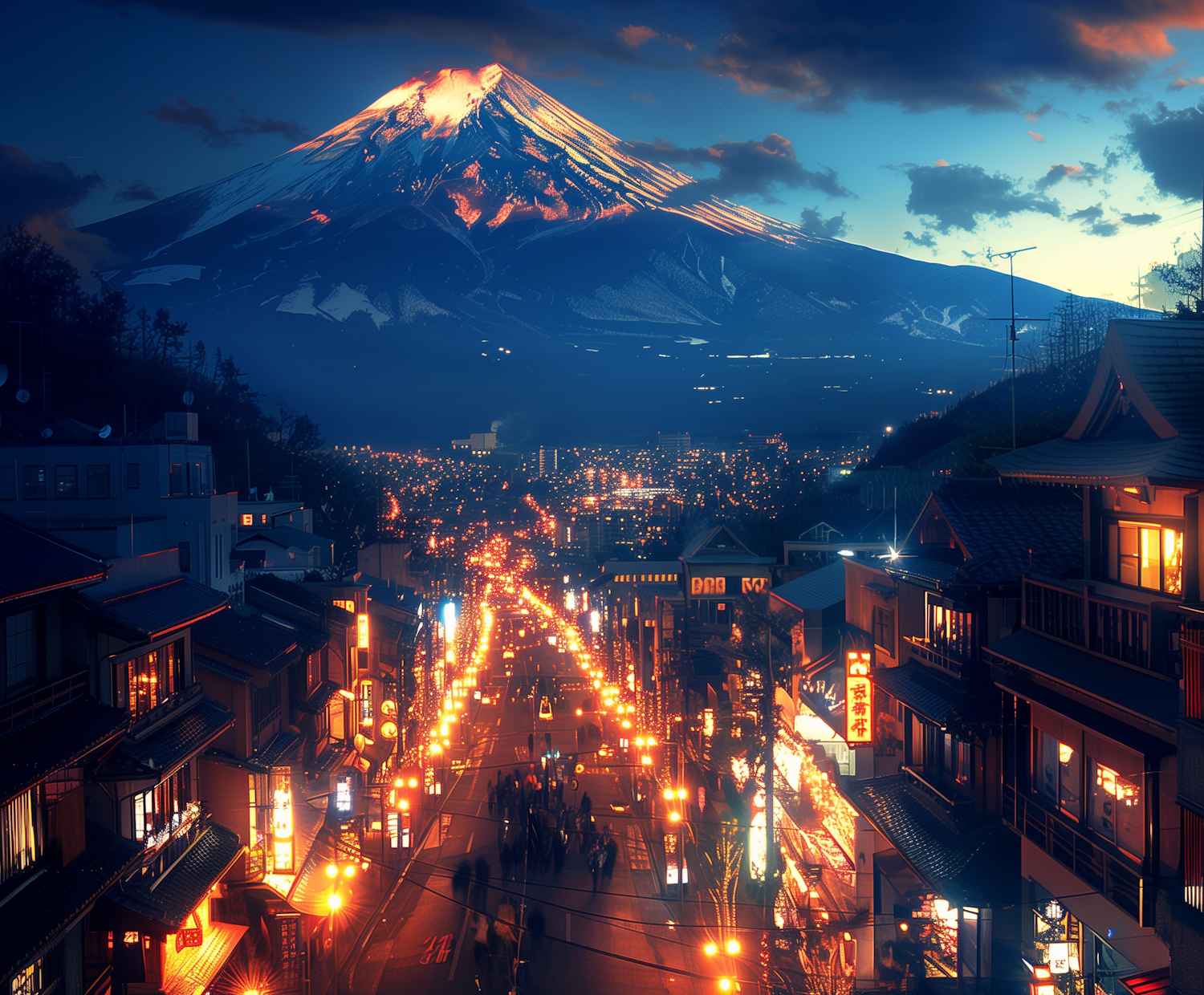 Evening street scene with glowing lights and Mount Fuji in the background, blending urban life with natural beauty.