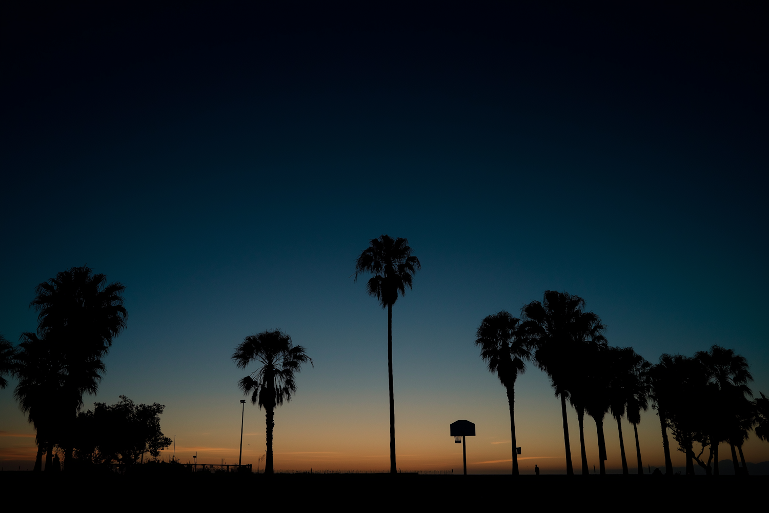 A calm twilight scene with silhouetted palm trees, a Venice basketball court, and people against a serene gradient evening sky.
