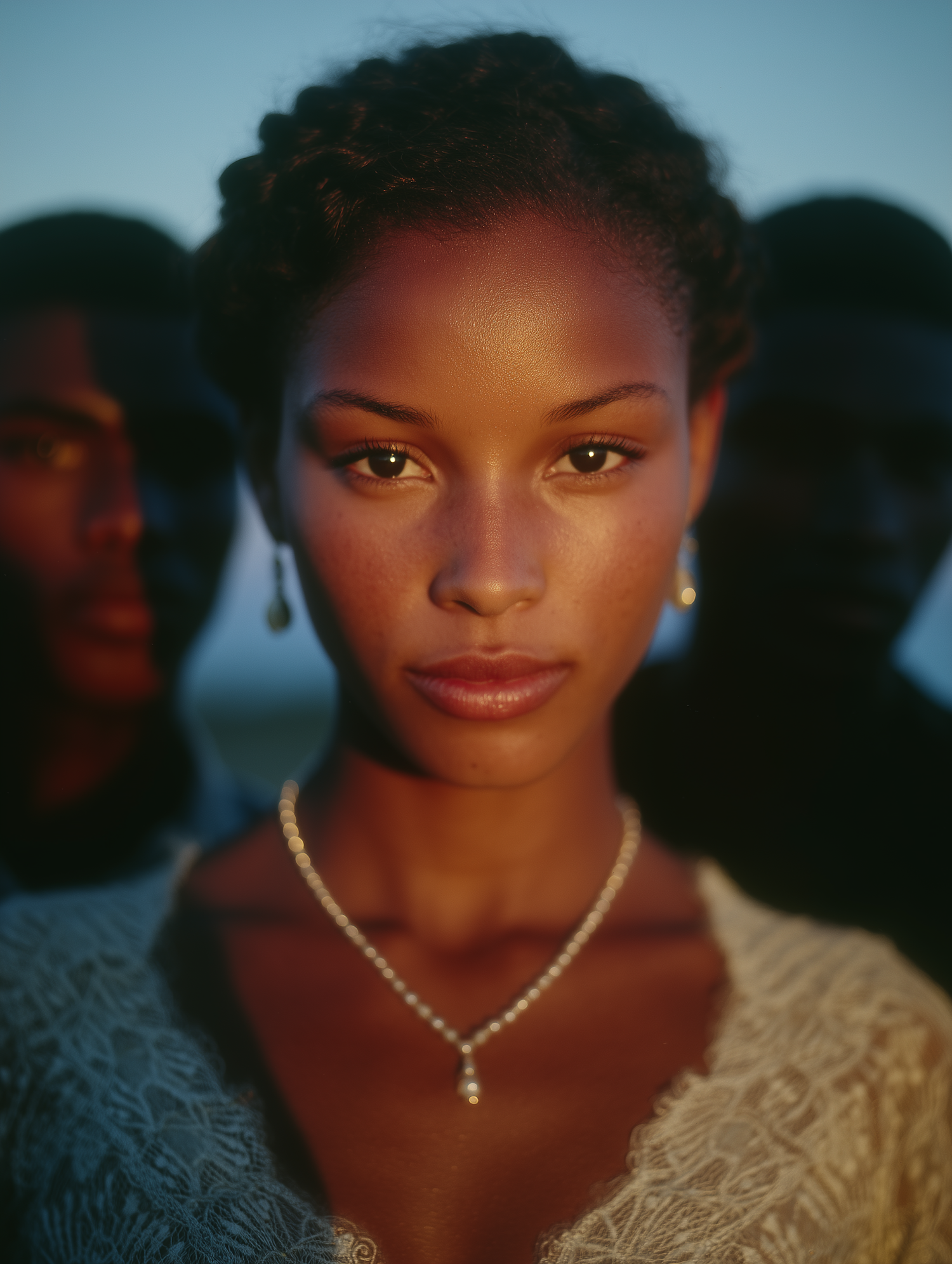 A stunning portrait of a young woman in soft evening light, wearing a delicate necklace and lace-textured attire, with a serene expression.