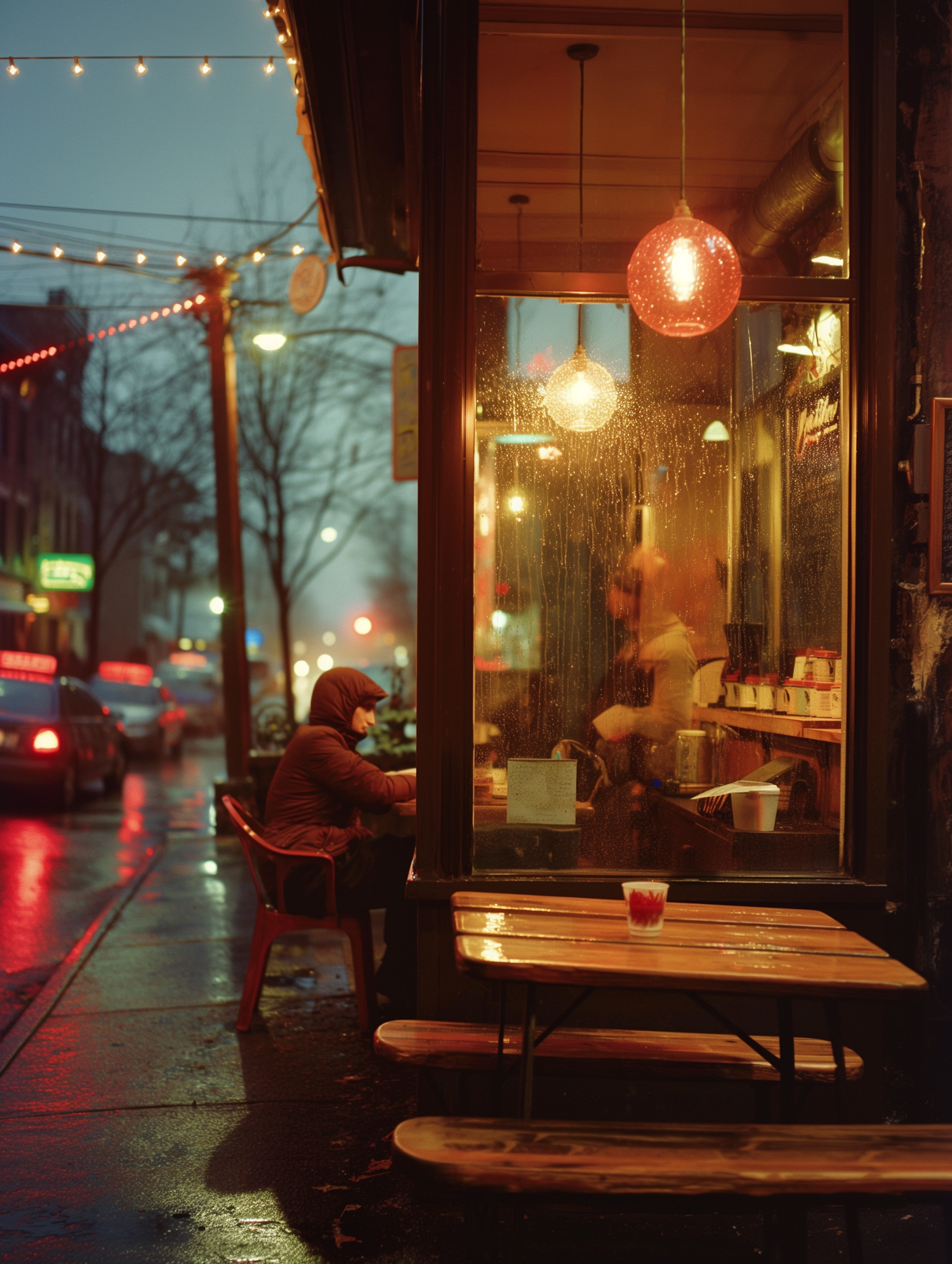 Cozy café scene at night with warm lights, rainy reflections, and a hooded figure sitting inside. Serene urban atmosphere.