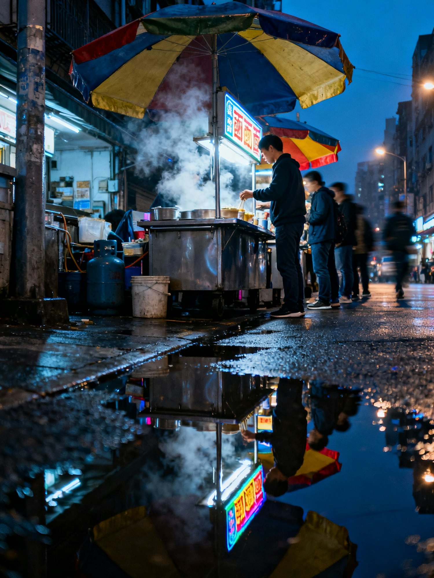 After-rain scene: queue at a noodle stall, puddle reflections of signs and umbrellas; one customer sharp, rest in motion. 28–35 mm, f/2.8, ISO 3200, 1/10–1/20 s with gentle pan; WB 3400 K; no polarizer (keep reflections). Negative: CGI puddles, neon clipping, tilted verticals, heavy noise reduction smearing.