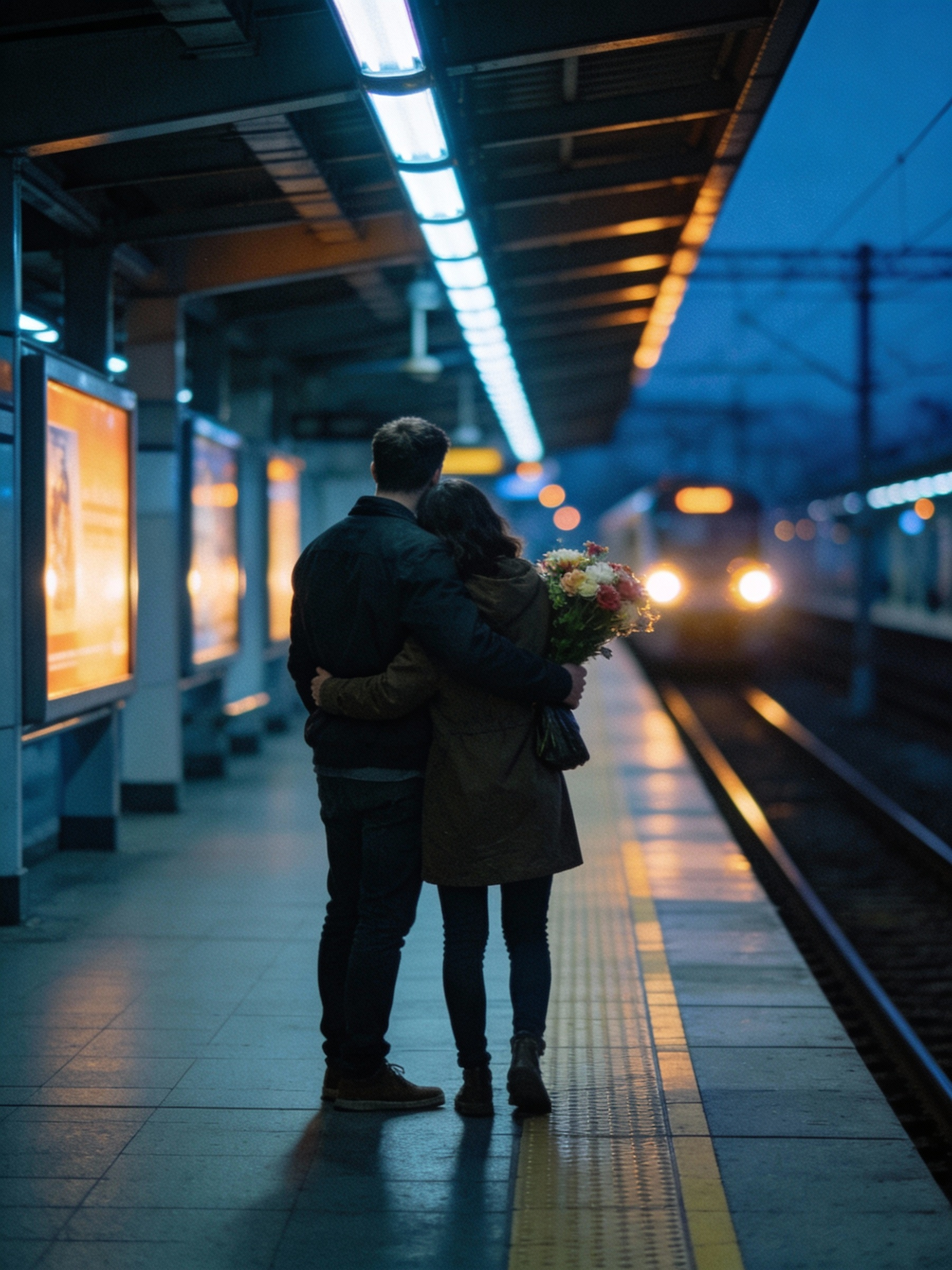 Ultra-realistic cinematic lifestyle photo, vertical 4:5. Blue hour in a clean modern metro station, cool overhead lighting mixed with warm ad-panel glow (no readable text). Couple seen from behind in a quiet hug near the platform edge, natural body language; bouquet tucked under one arm. Train lights in the distance create soft bokeh. 35mm look, shallow DOF, strong but realistic contrast, warm highlights + cool shadows, premium editorial retouch, subtle film grain.