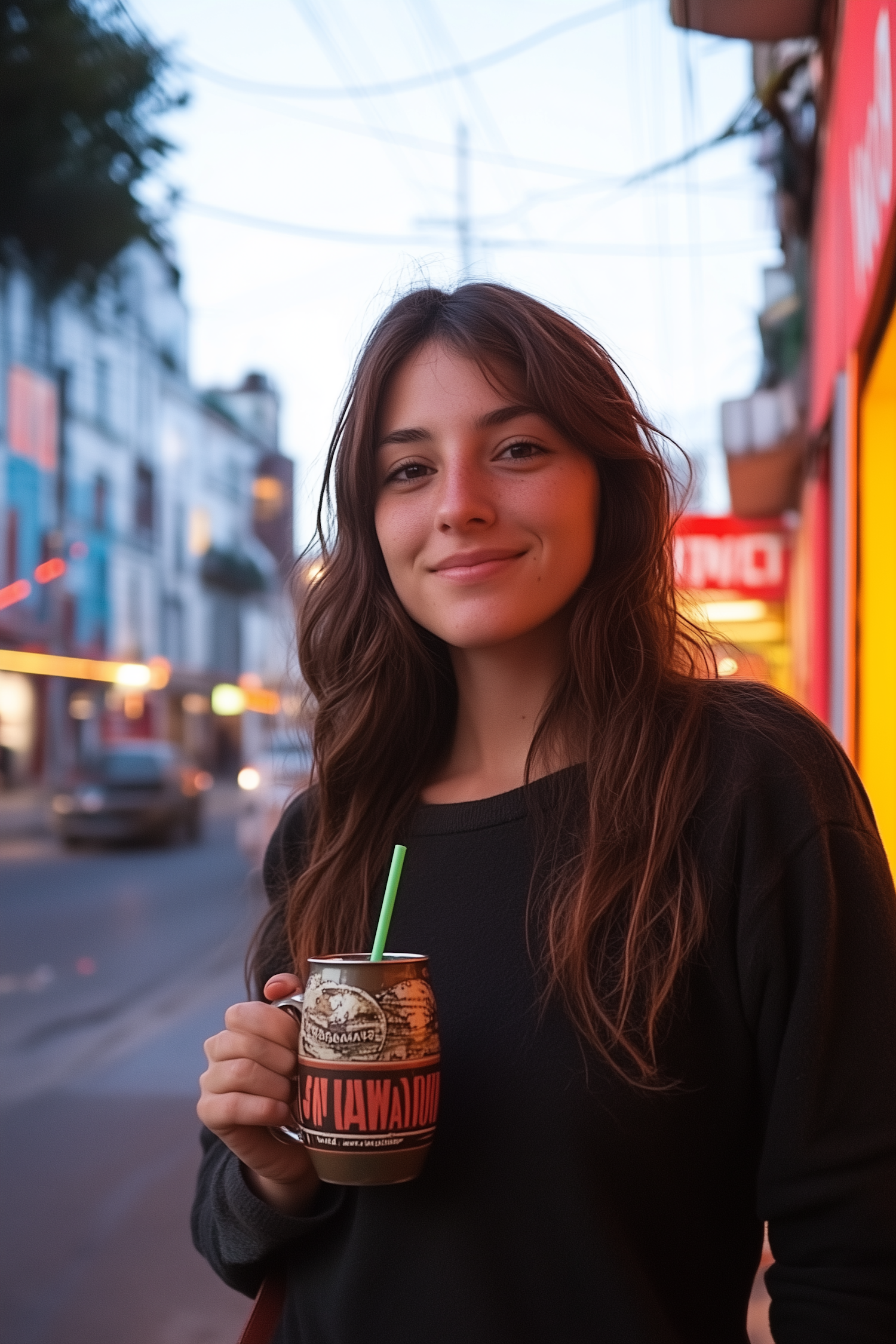 A young woman with wavy brown hair holds a mug with a green straw, standing on a lively street with glowing evening lights.