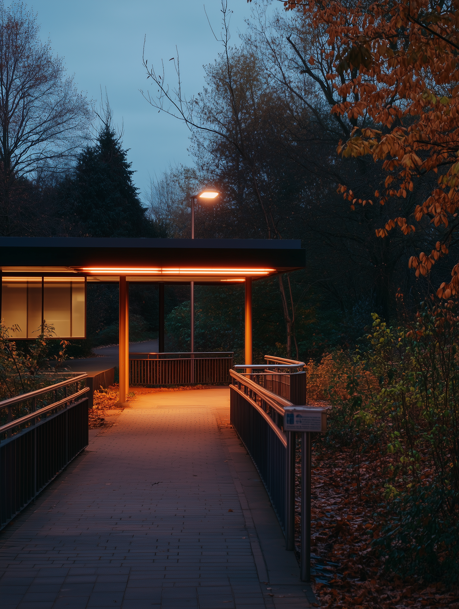 A warmly lit pedestrian walkway surrounded by autumn trees, leading to a modern structure under an overcast evening sky.