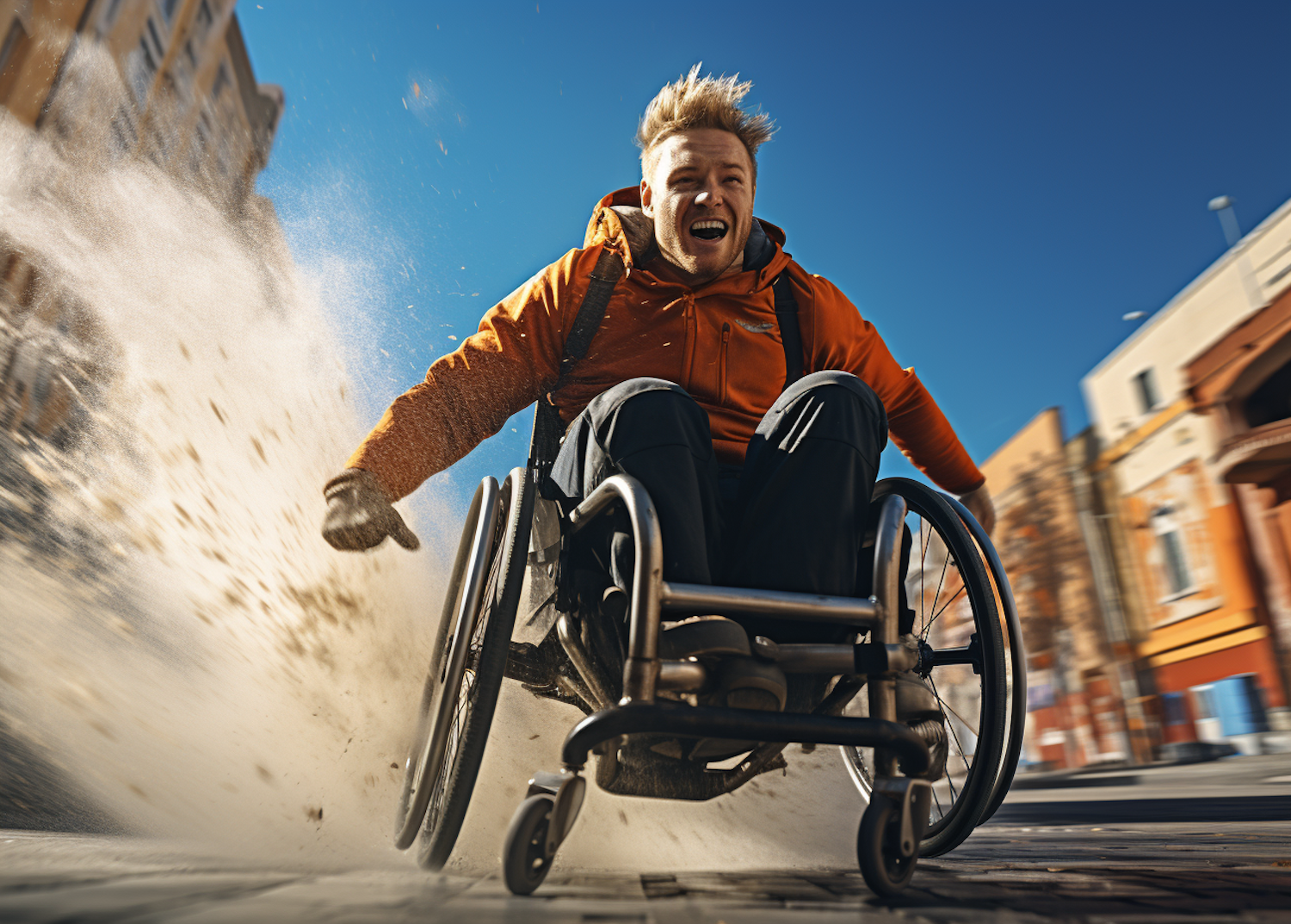 Energetic man in a wheelchair racing down a city street, exuding joy and freedom. Vibrant colors and dynamic motion create an exhilarating scene.