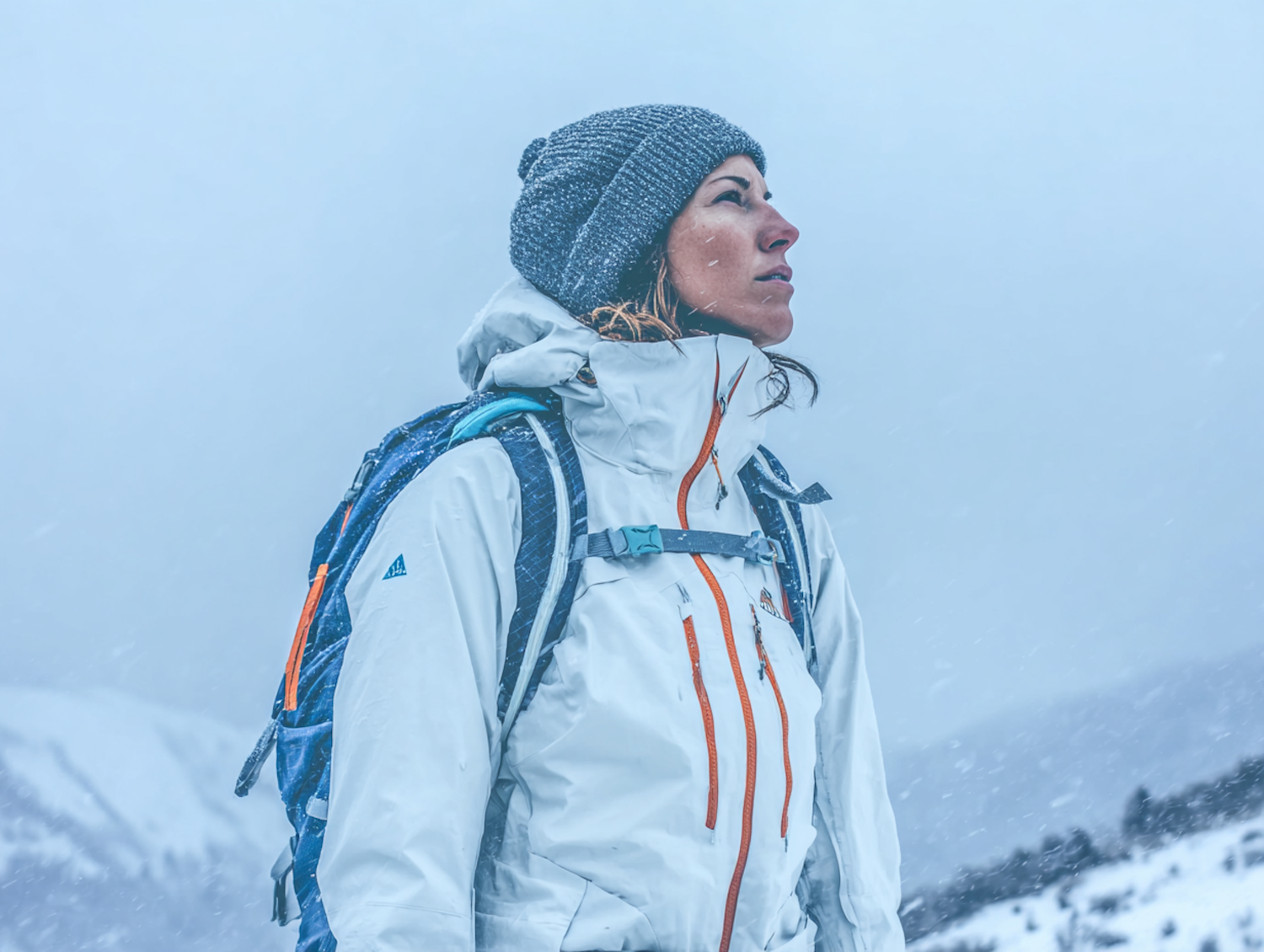 A person in winter gear stands in snowy conditions, wearing a white jacket and carrying a backpack, with snow-covered mountains in the background.