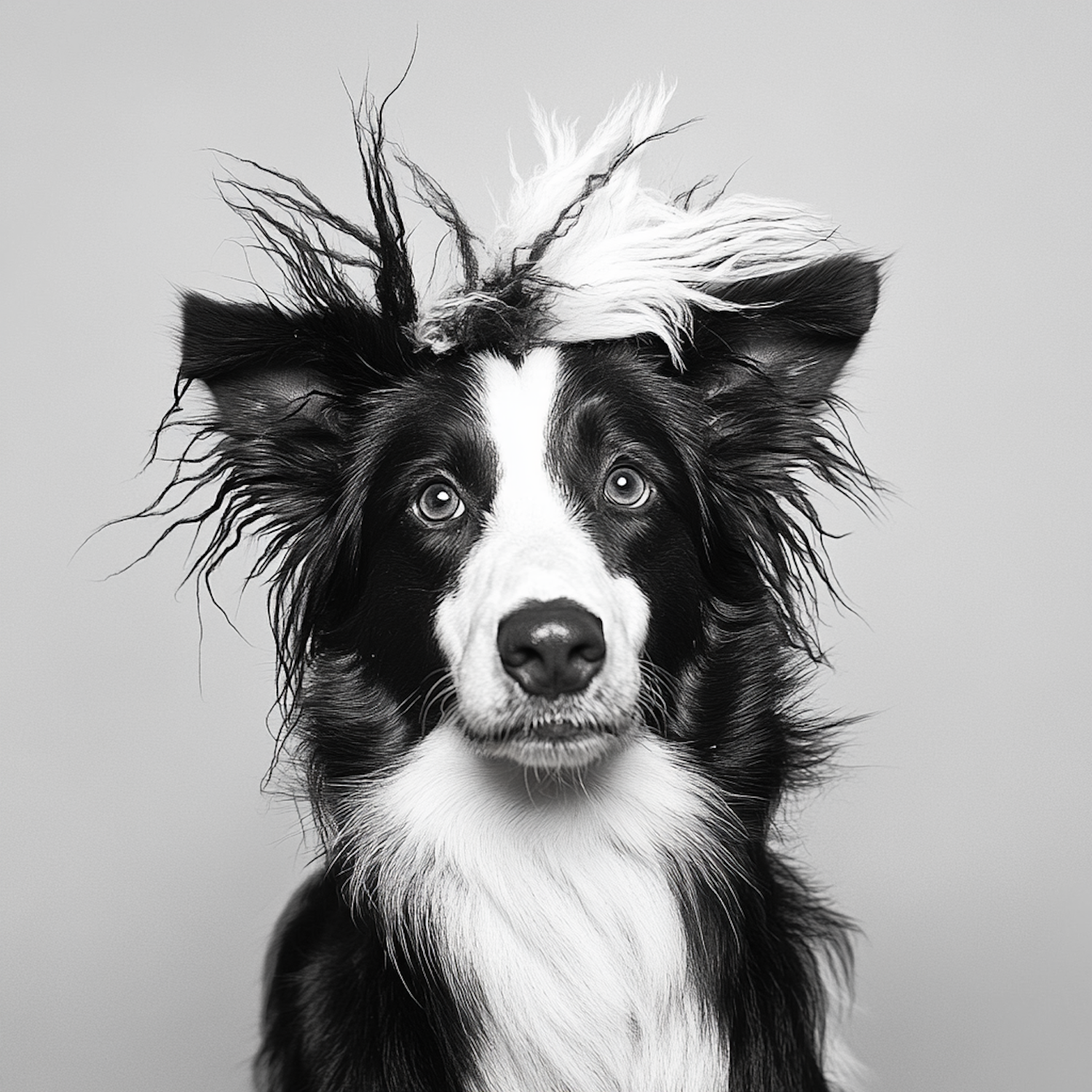 Black and white photo of a Border Collie with wild, fluffy fur and a curious expression against a plain gray background.