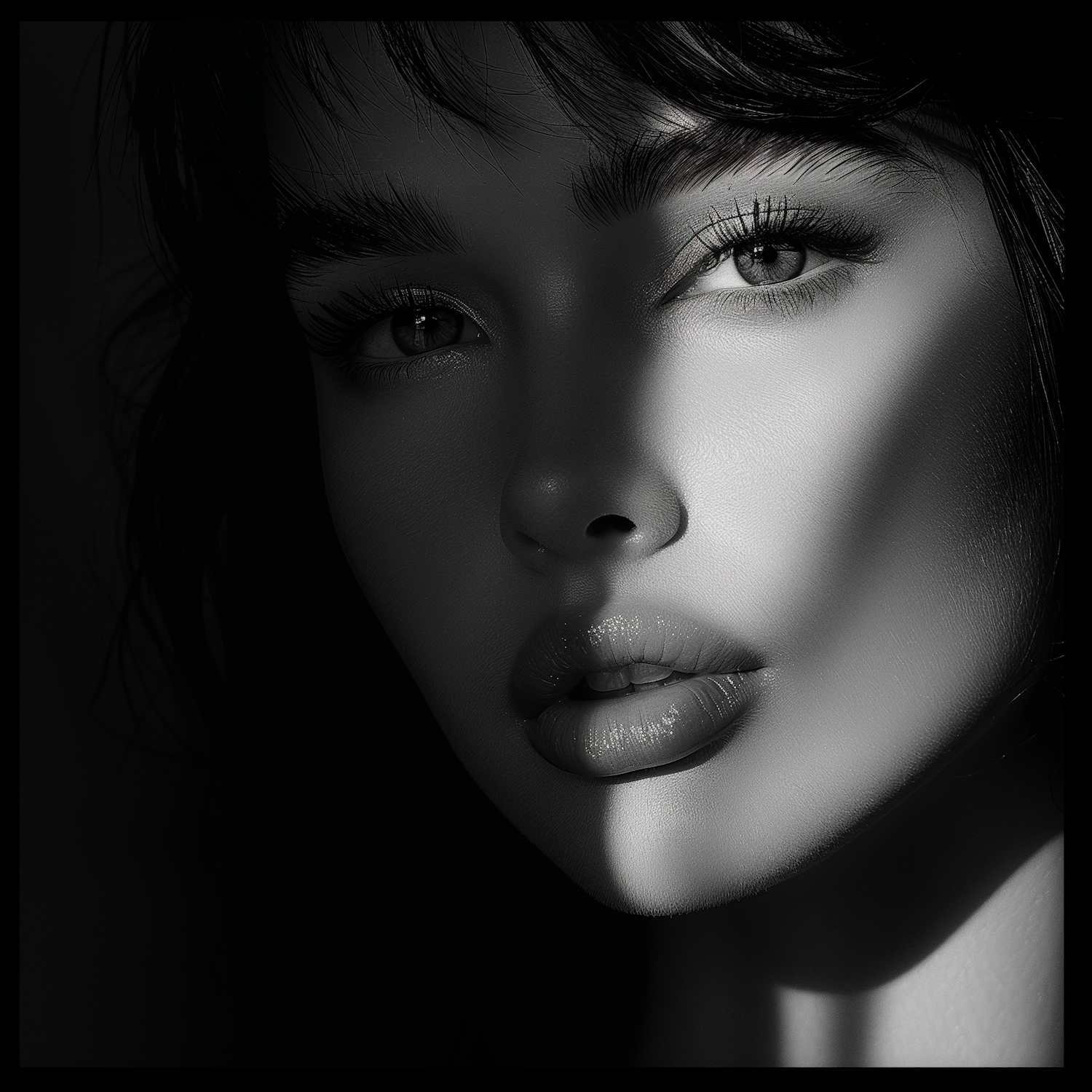 Black and white close-up portrait of a woman with dramatic lighting and expressive eyes, highlighting her striking features.