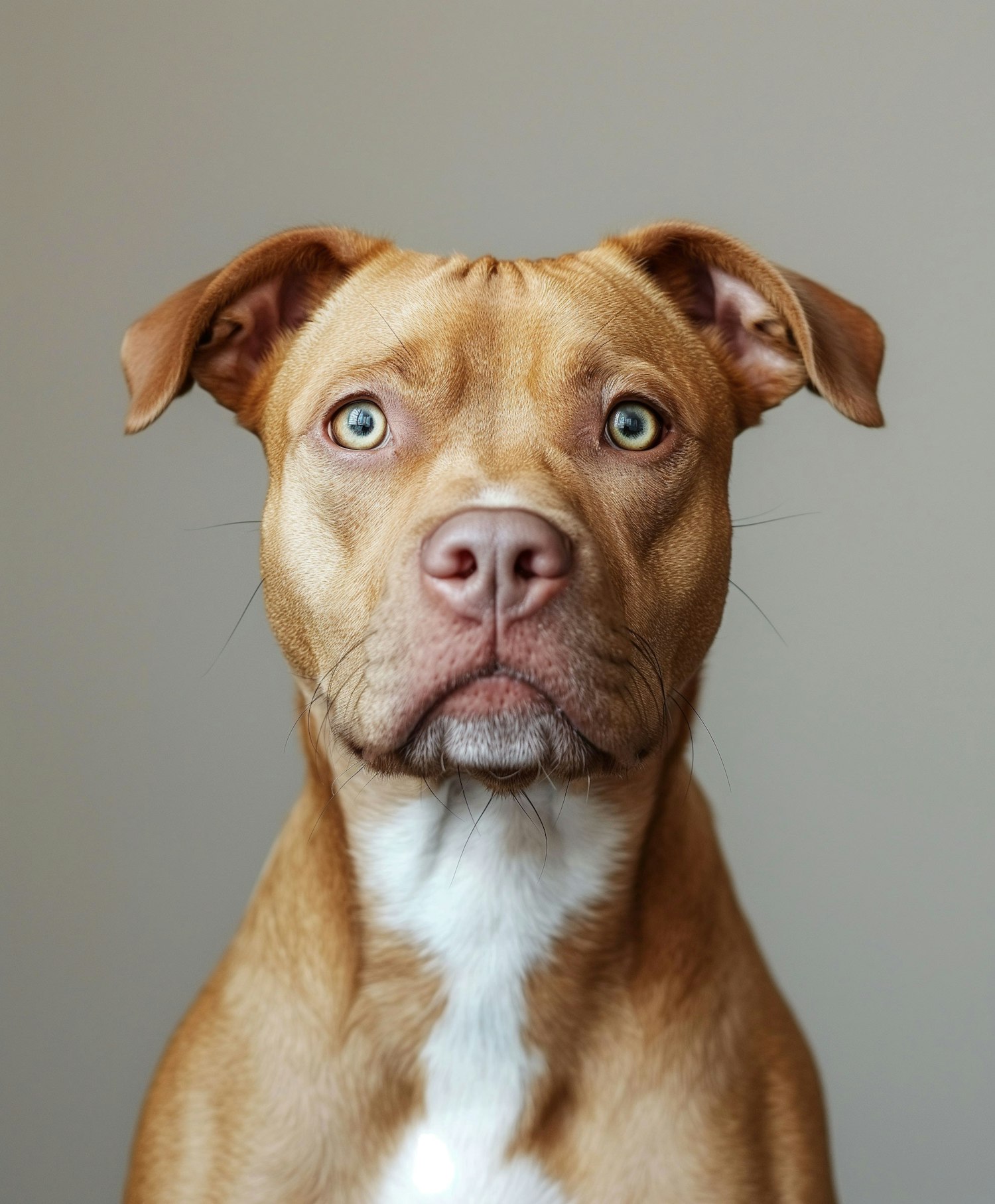 Close-up portrait of a brown dog with green eyes and a white chest patch, set against a neutral background.
