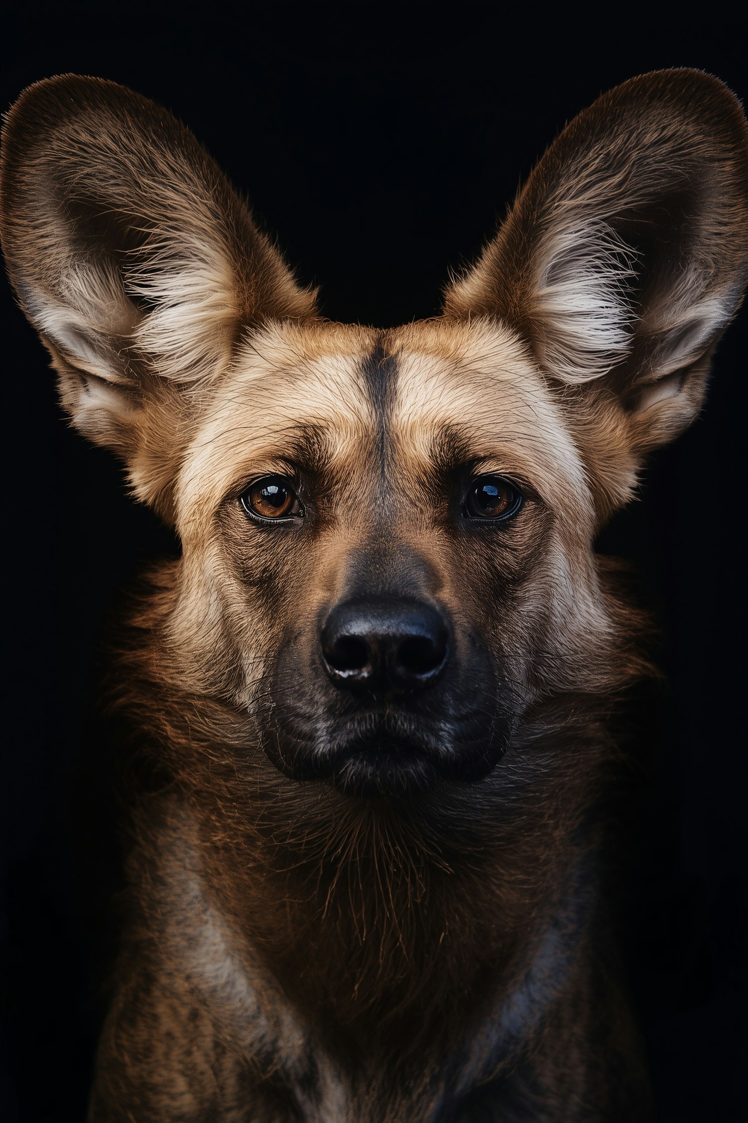Close-up of a dog with large ears and expressive eyes, set against a dark background, highlighting its detailed fur and focused gaze.
