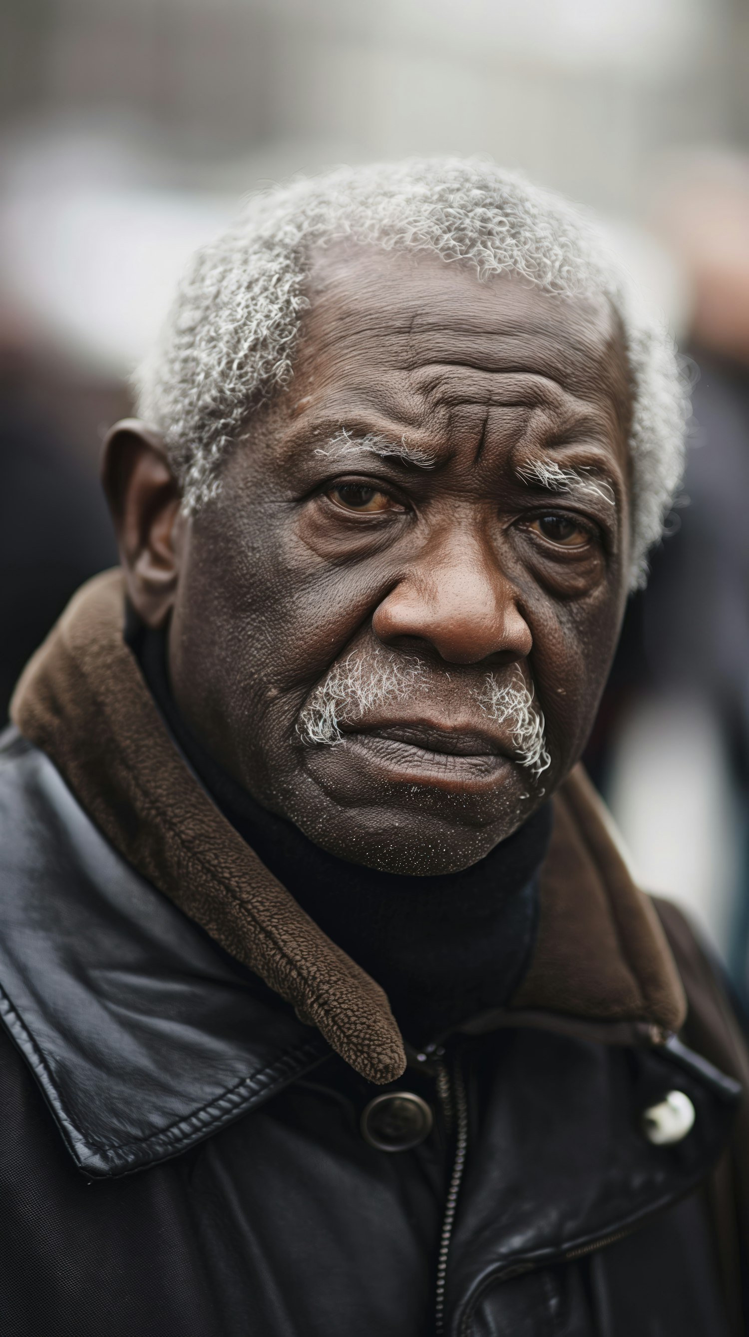 Elderly Black man with gray hair and mustache in a leather jacket, gazing seriously at the camera. Soft lighting highlights his features.