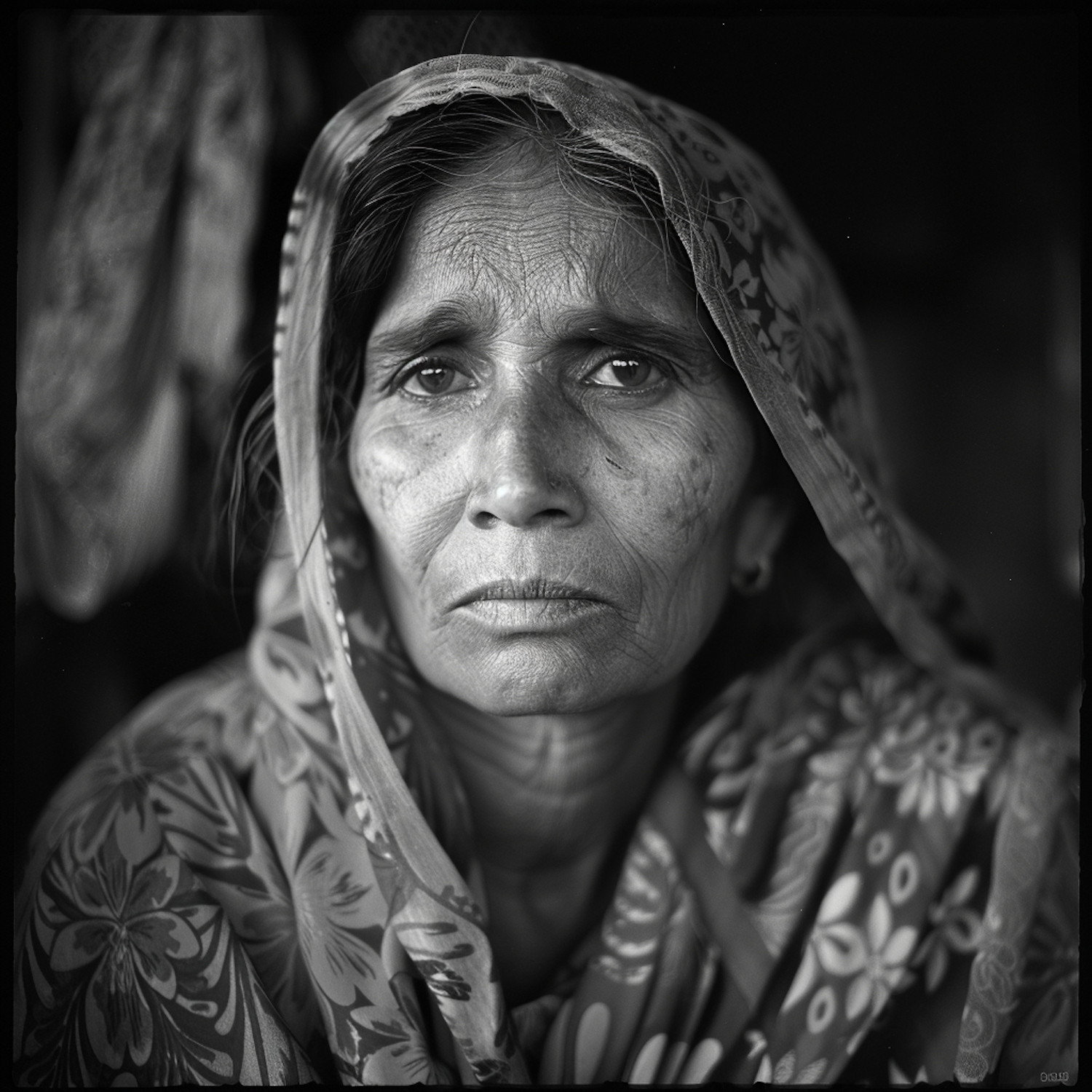 Black and white portrait of an older South Asian woman with a patterned headscarf, conveying wisdom and experience.