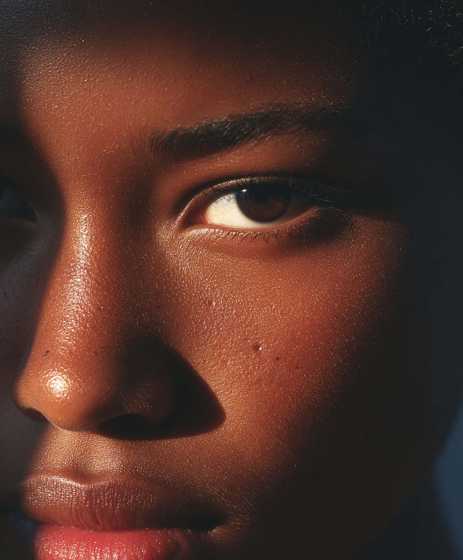 Close-up of a person's eye and face, showcasing natural beauty with warm lighting and detailed textures.