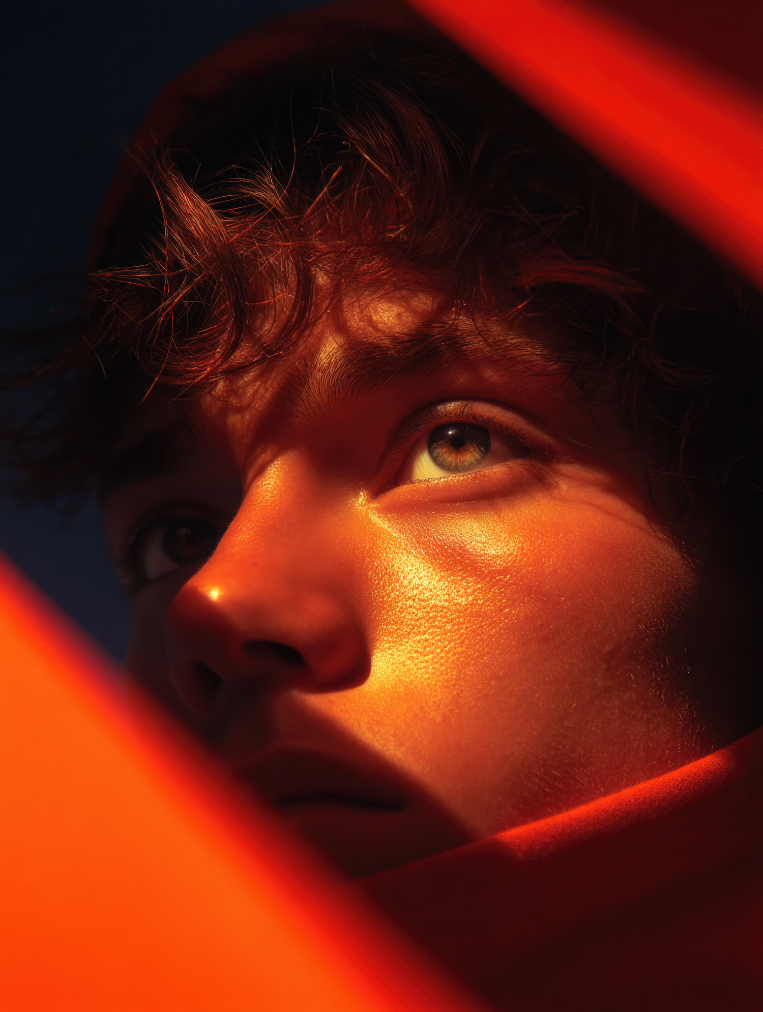 A close-up image of a person's face under warm lighting, framed by an orange fabric, showcasing dramatic light and shadow contrasts.