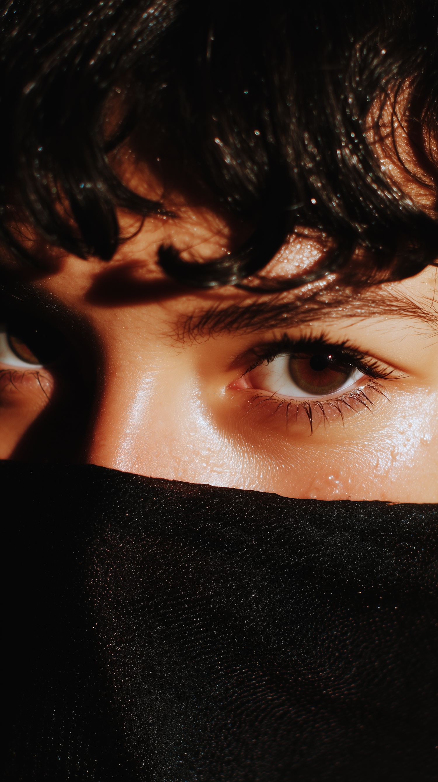 Close-up of expressive brown eyes framed by dark hair, with a black fabric covering the lower face, creating a mysterious vibe.