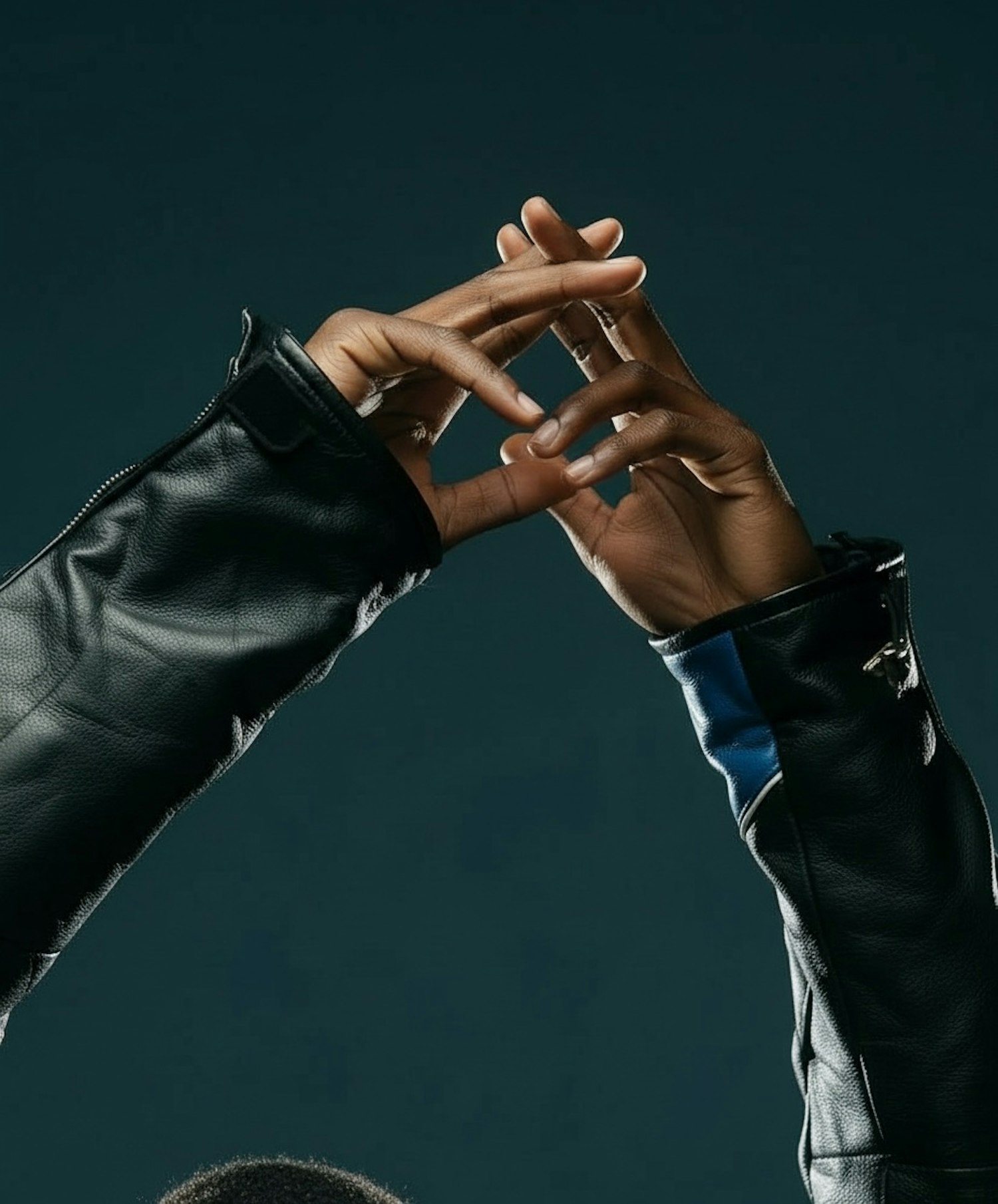 Close-up of hands in a leather jacket, fingers intertwined against a dark background, showcasing texture and expressive gesture.