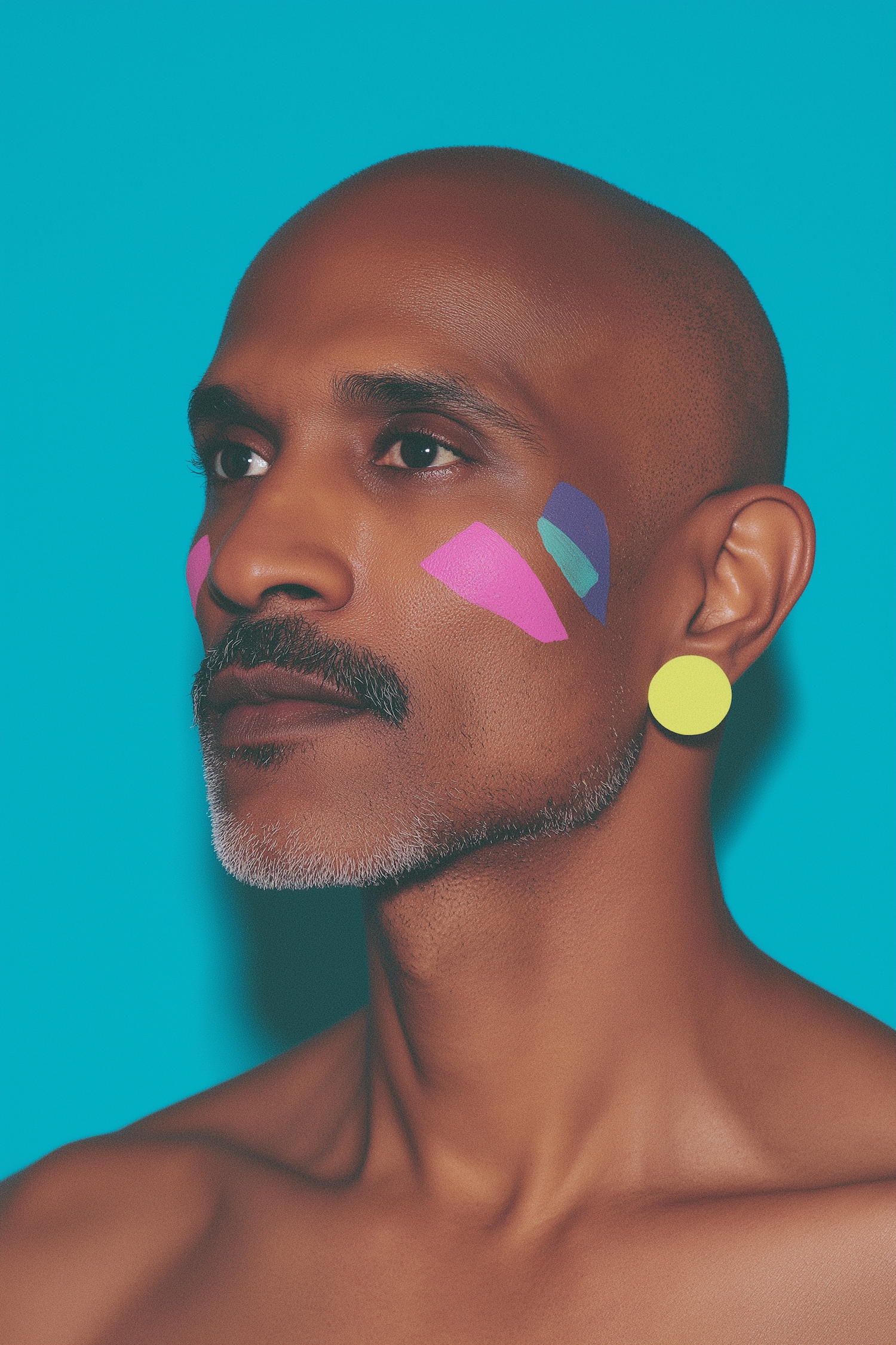Vivid portrait of a person with colorful face paint, bright circular earring, and shaved hairstyle against a solid blue background.