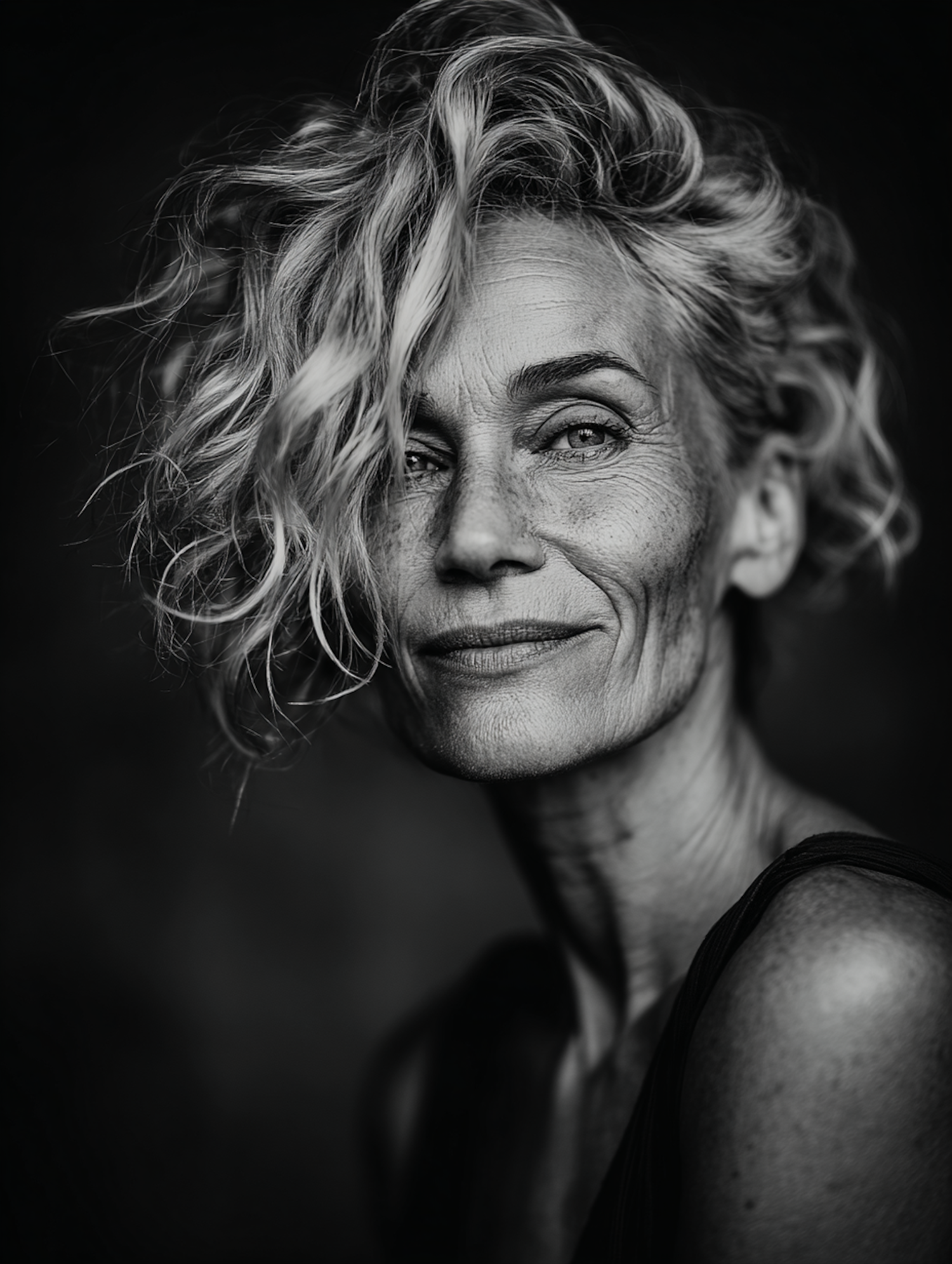 Black-and-white portrait of a mature woman with curly hair, light eyes, and a confident expression, emphasizing natural beauty and character.
