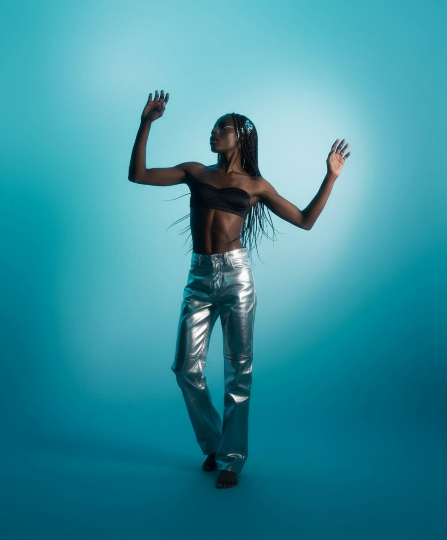 A stylish individual poses in metallic silver pants and a black top against a vibrant blue background, showcasing a modern aesthetic.