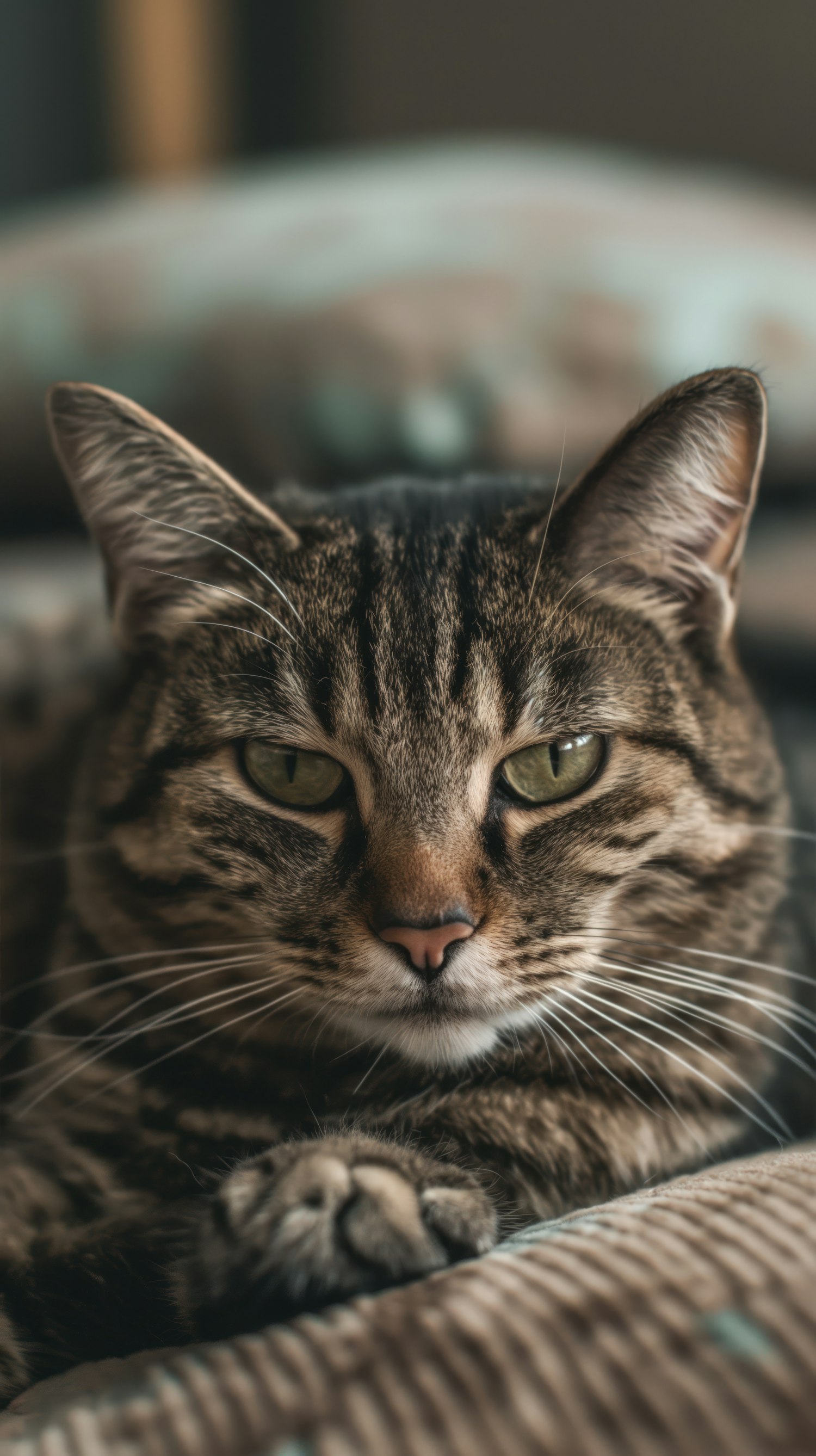 Close-up of a tabby cat with green eyes, lying on a soft surface. The cat's striped fur and attentive gaze create a cozy atmosphere.