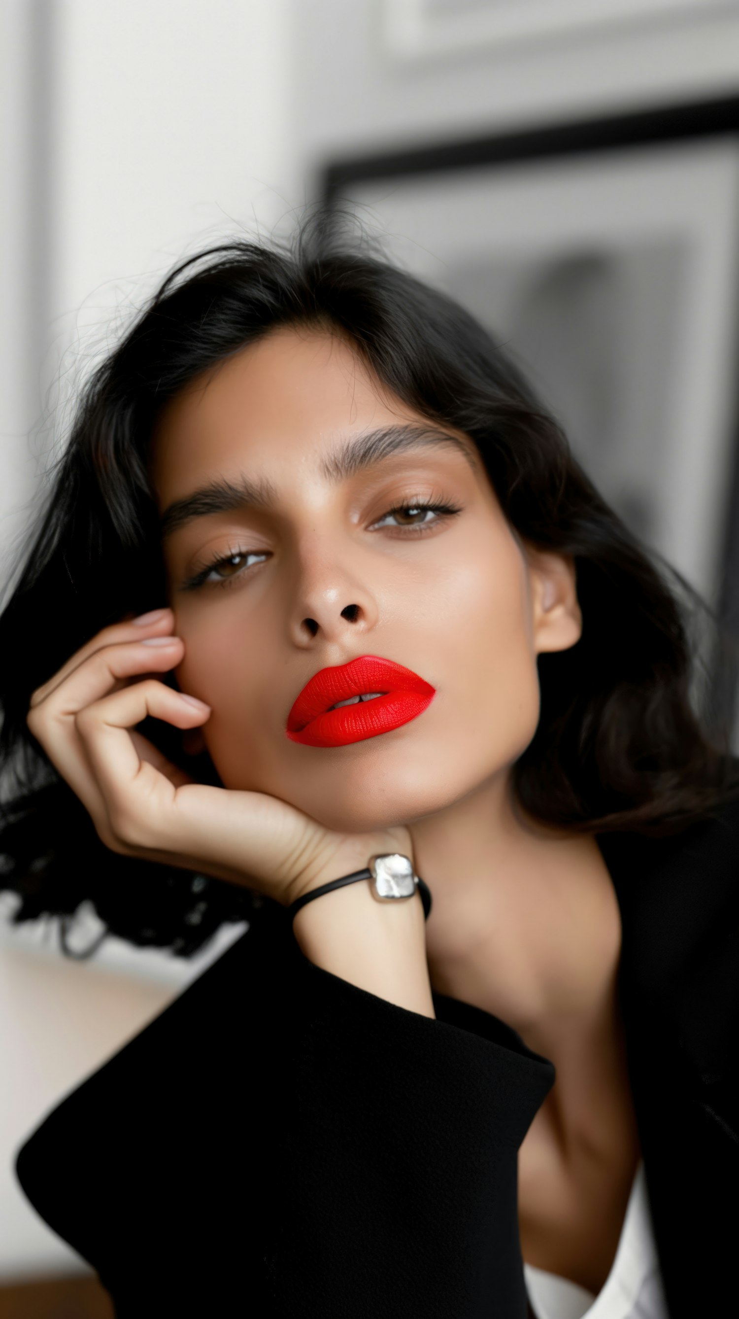 Woman with bold red lips and dark hair, wearing a black jacket, gazes confidently. Soft blurred background enhances focus on her face.