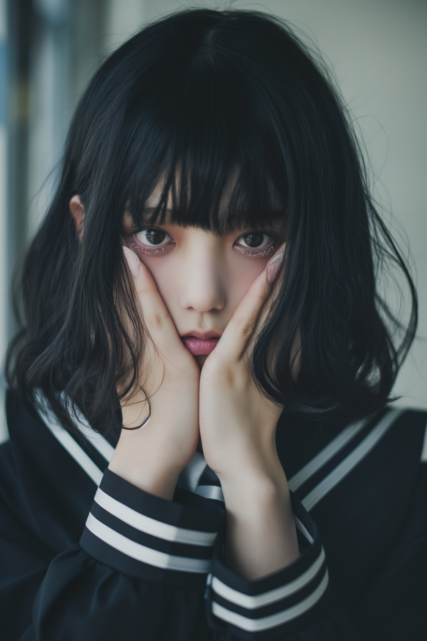 Close-up of an Asian woman with dark hair and glittery eye makeup, wearing a sailor-style outfit, gazing intently at the camera.