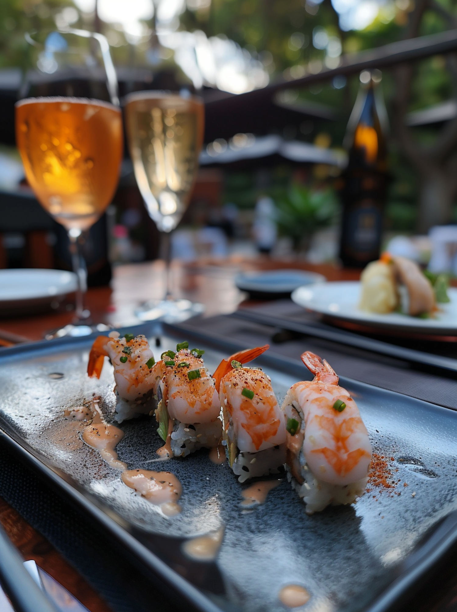 Elegant sushi platter with shrimp and sparkling drinks in an outdoor dining setting, perfect for a sophisticated meal.