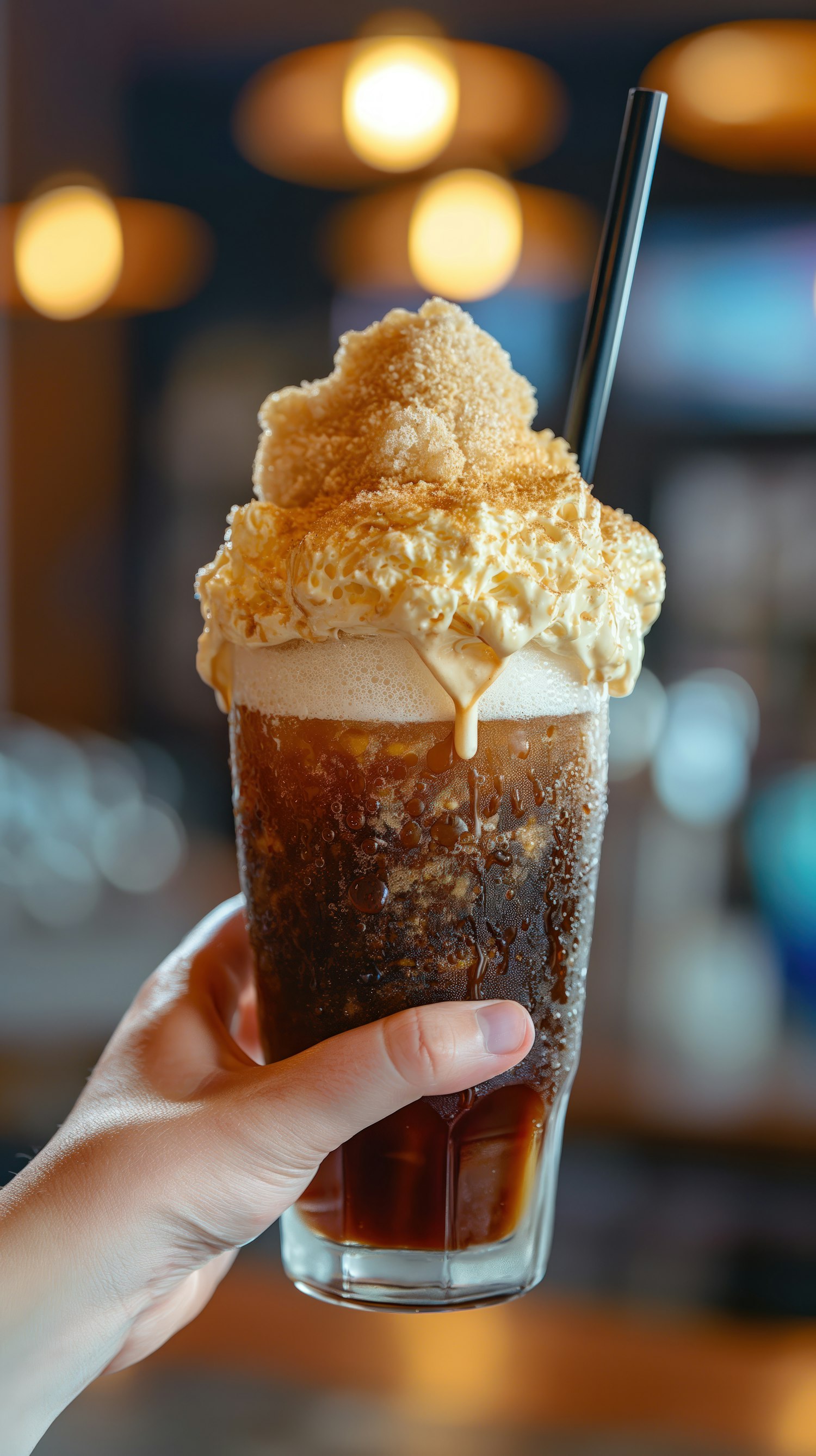 Tall glass of fizzy cola with whipped topping and straw, held in hand. Warm, cozy background with glowing lights.