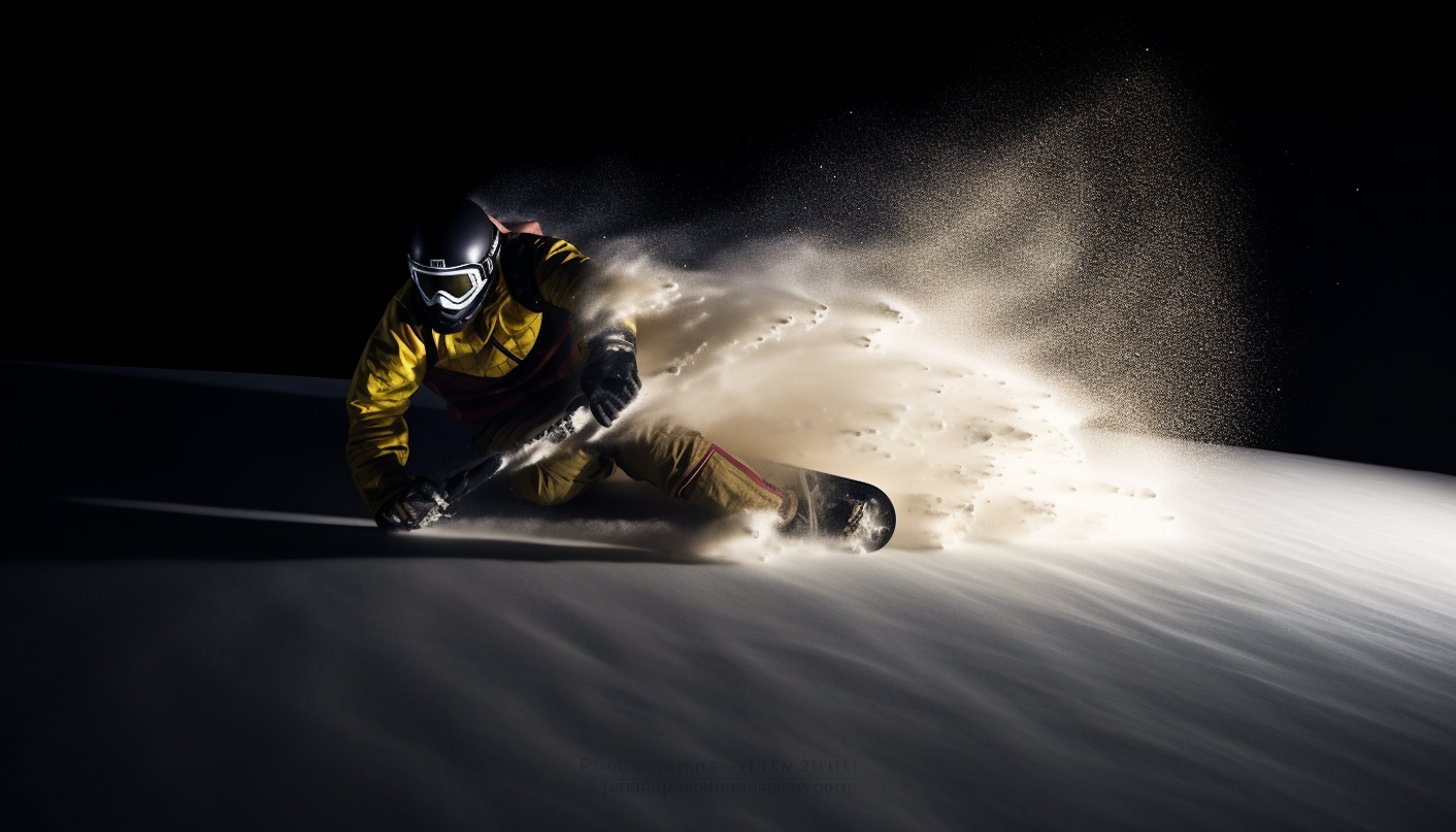 Dynamic shot of a snowboarder carving through fresh powder, wearing a yellow jacket and helmet, against a dark background.