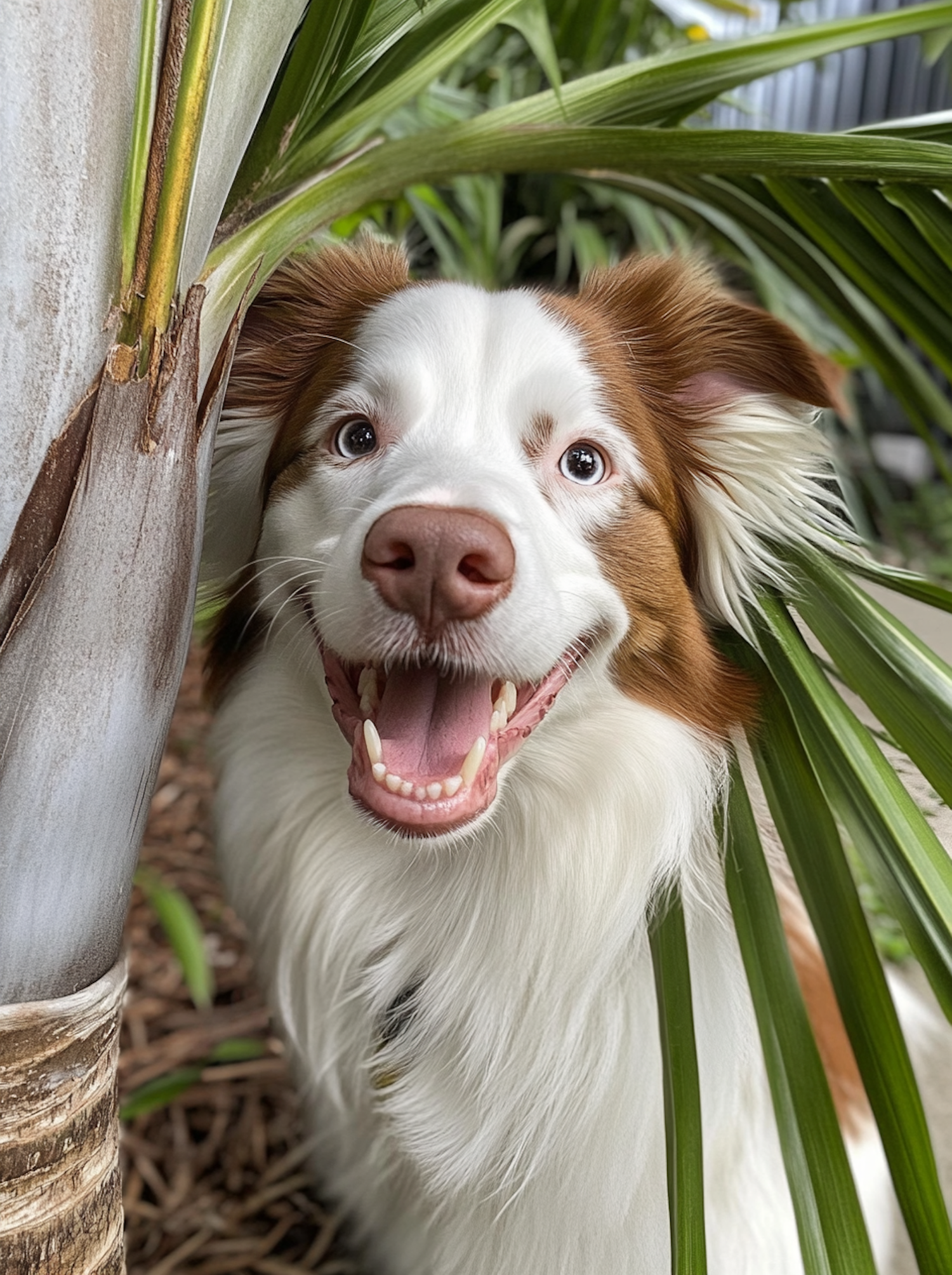 Happy dog with white and brown fur peeking through palm leaves, showcasing a joyful expression in a lush green setting.
