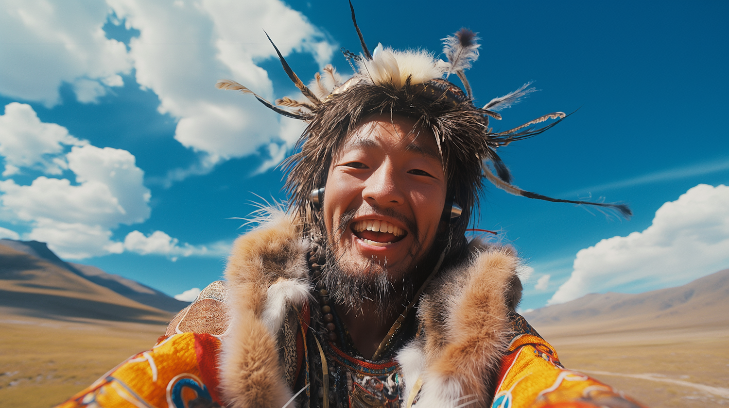 Joyful man in traditional attire with feathered headgear, set against a vast landscape and blue sky. Captivating cultural portrait.