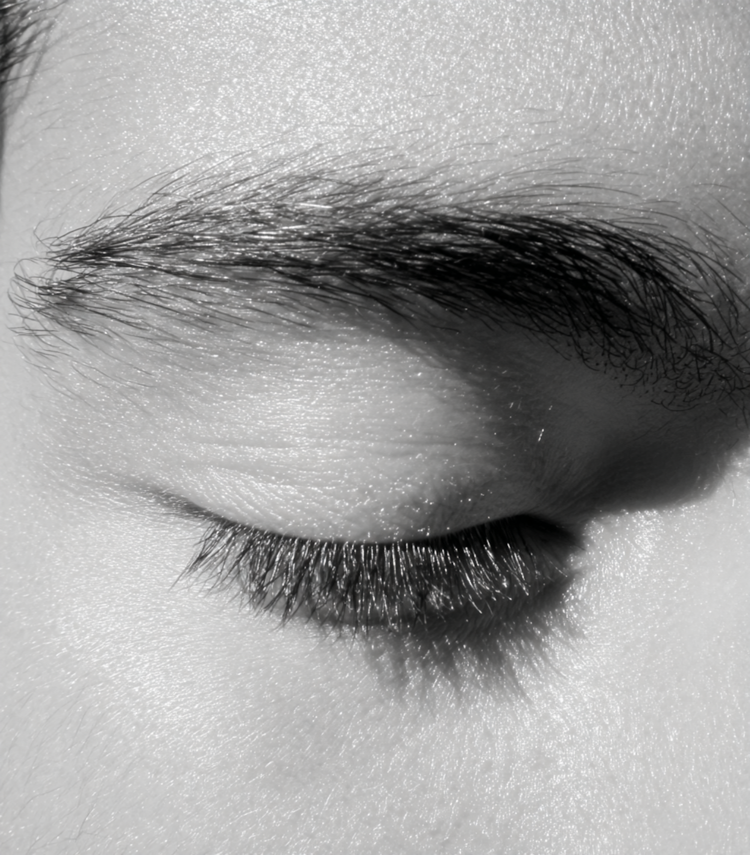 Close-up black-and-white photo of a closed eye, highlighting skin texture, eyelashes, and eyebrow details.