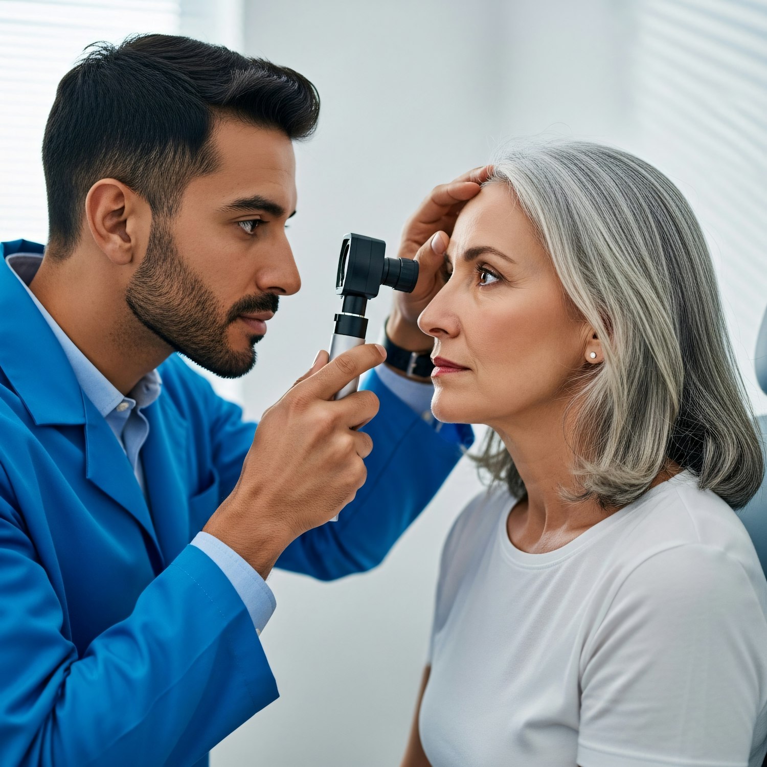 A doctor in a blue coat examines a patient's eyes with an ophthalmoscope in a well-lit clinical setting.