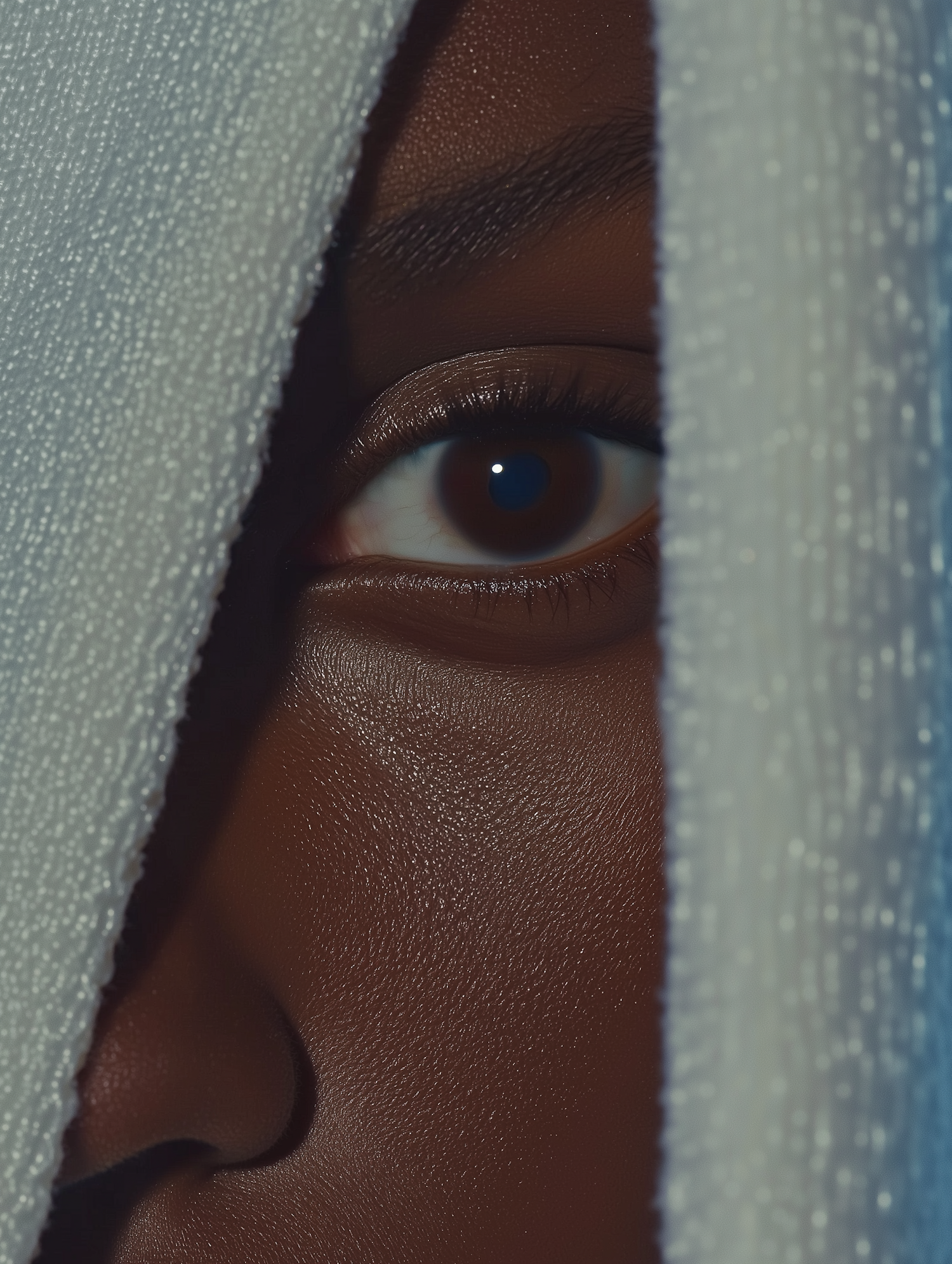 Close-up of a dark brown eye peeking through textured white fabric, creating a mysterious and intimate atmosphere.