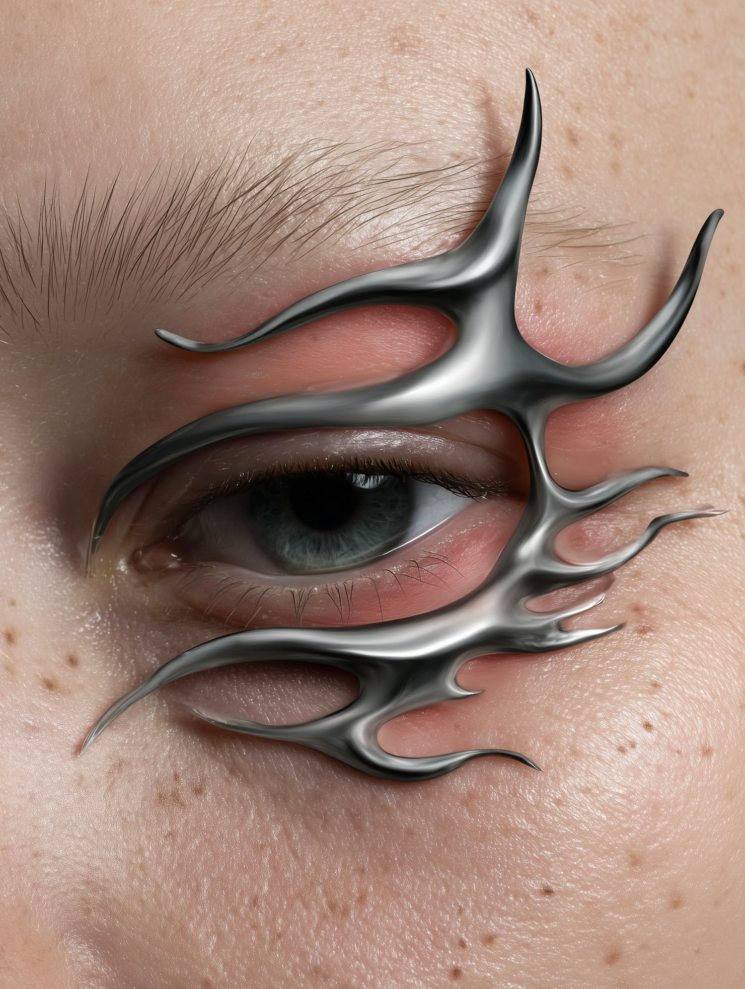 Close-up of a human eye with a metallic flame-like accessory, showcasing intricate details of skin texture and a striking design.