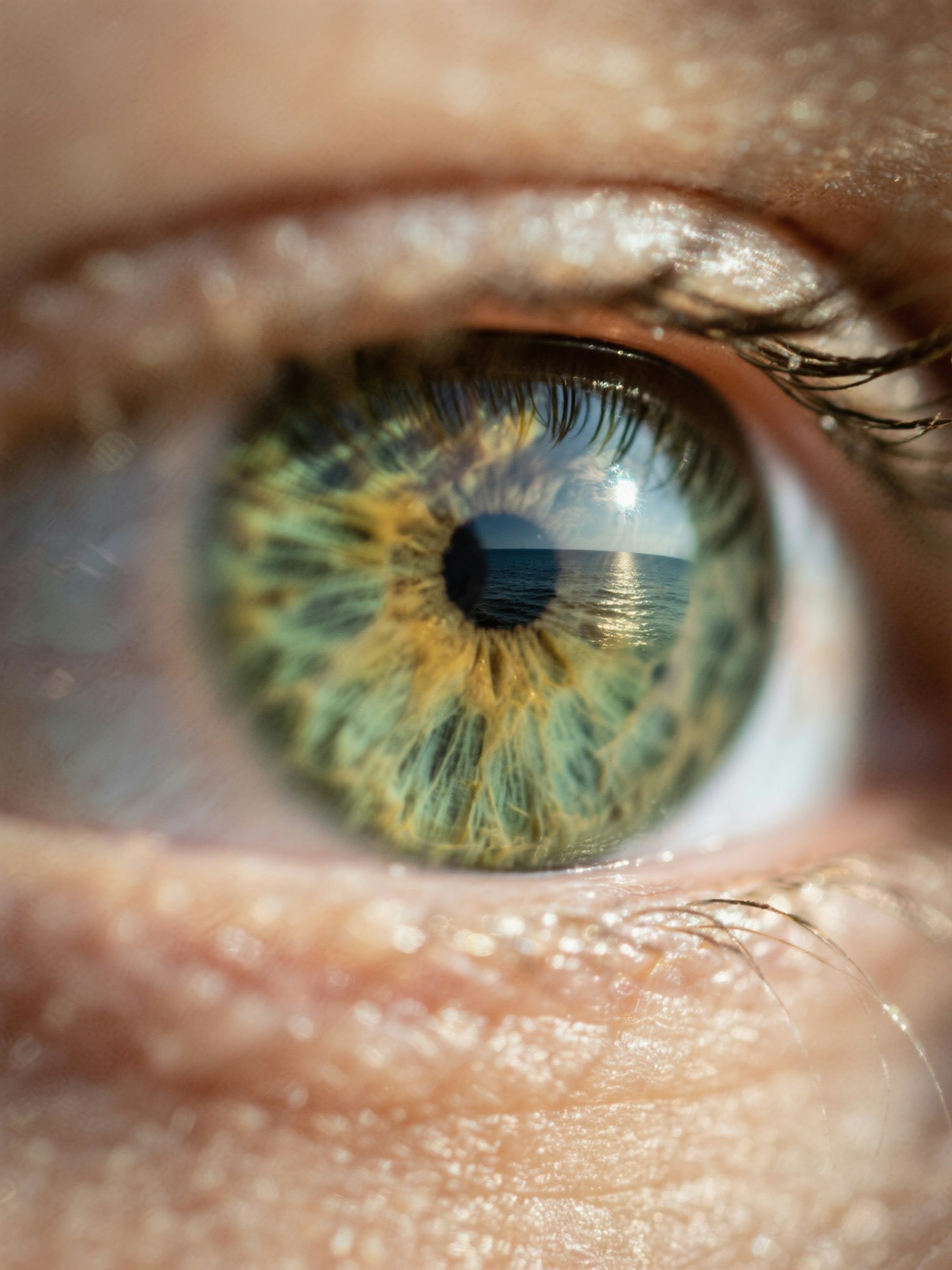 Close-up of a green and yellow iris reflecting a serene sunset over water, showcasing intricate eye details and natural textures.