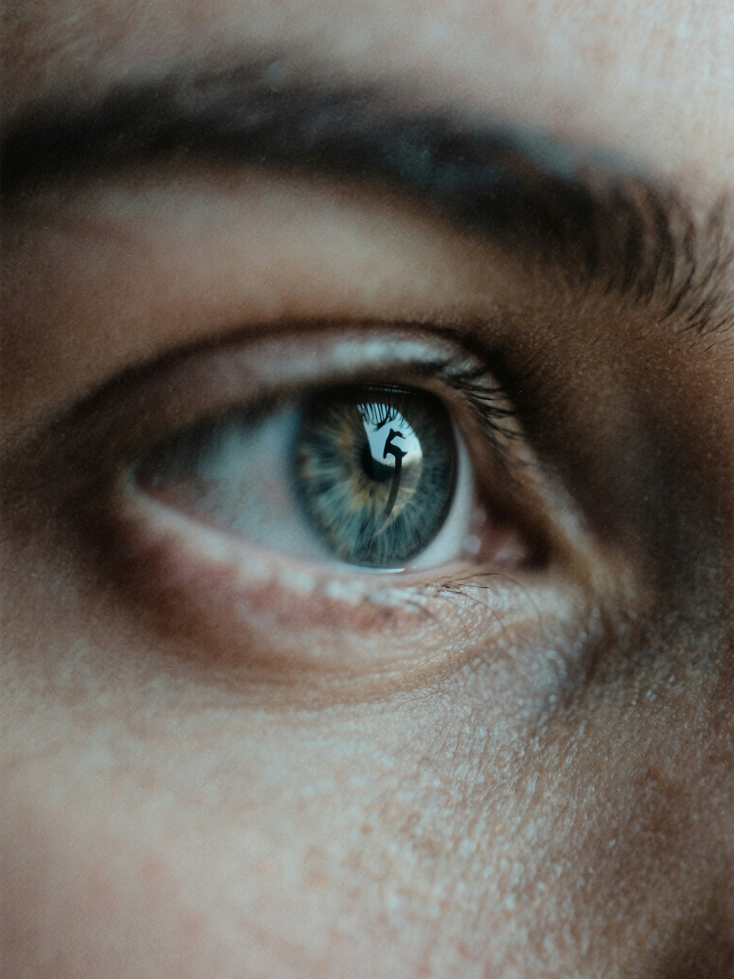 Close-up of a blue eye with a yoga pose silhouette reflected in the iris, showcasing intricate details and artistic lighting.