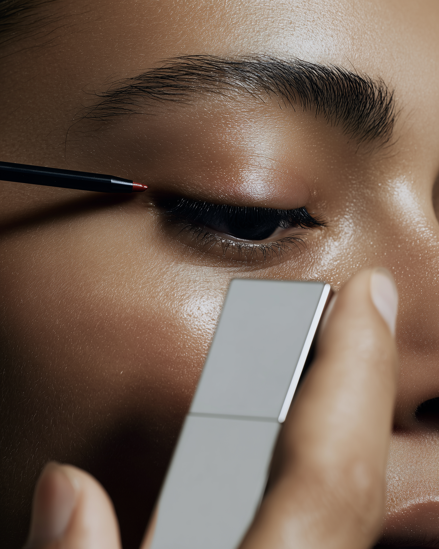 Close-up of a person applying eyeliner with precision, showcasing smooth skin and a glowing complexion.