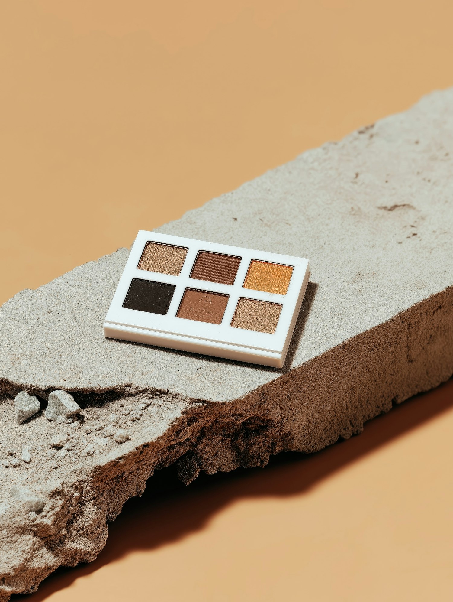 A sleek eyeshadow palette with six neutral and warm shades displayed on a textured concrete slab against a beige background.