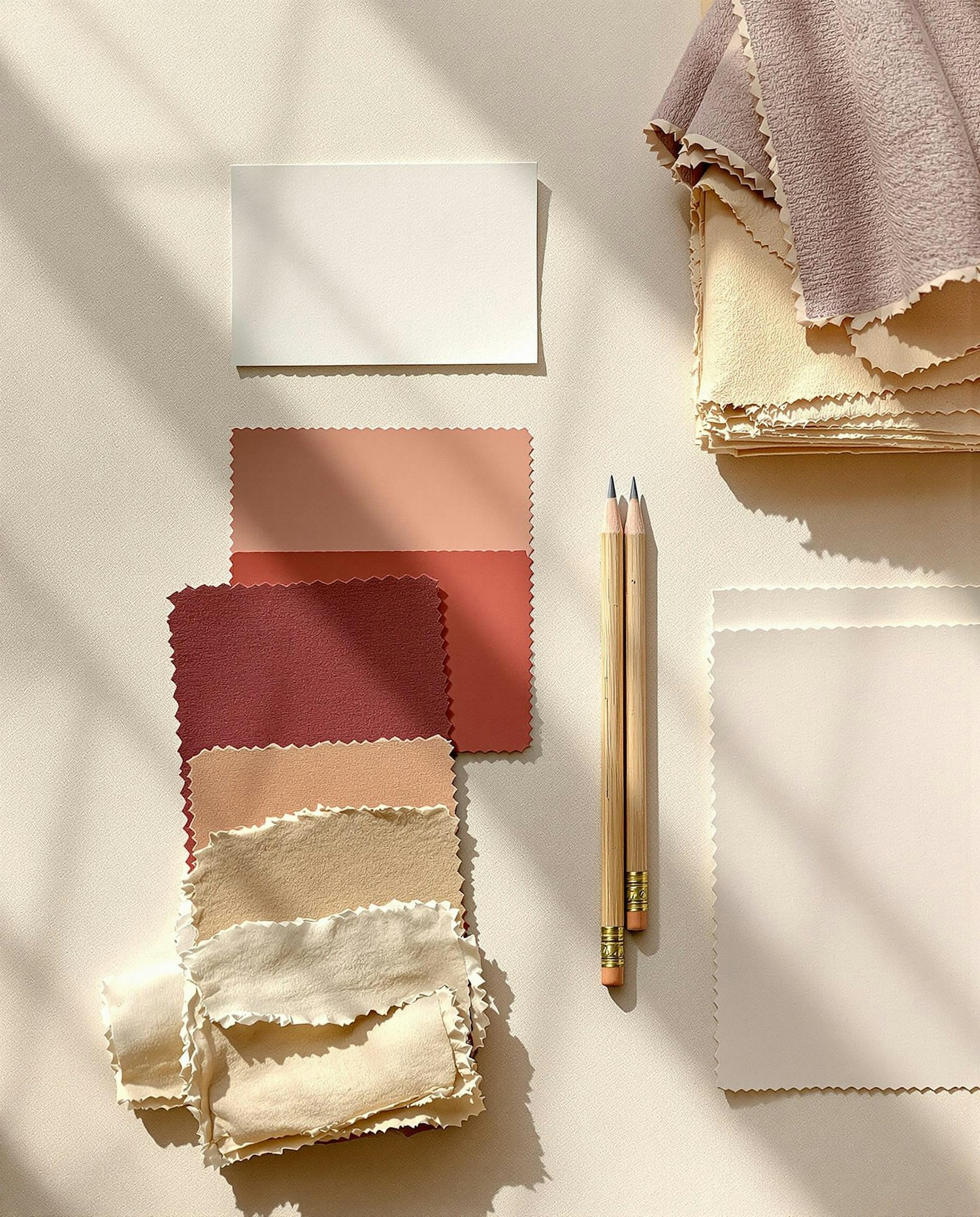 Flat lay of fabric swatches in warm tones, wooden pencils, and paper on a light surface with soft natural lighting and shadows.