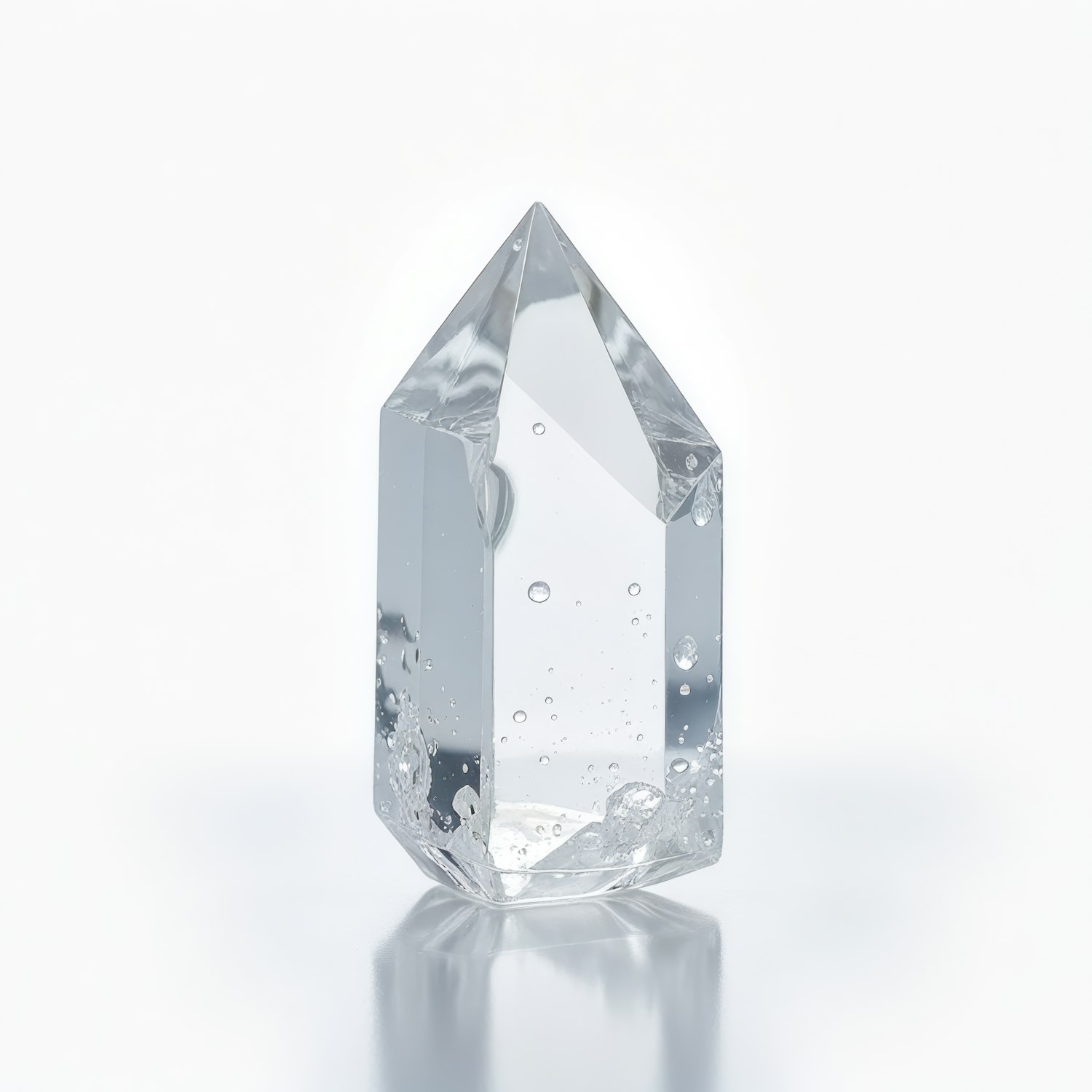 Clear faceted crystal with bubbles inside, standing upright on a white background. Minimalist and elegant design.