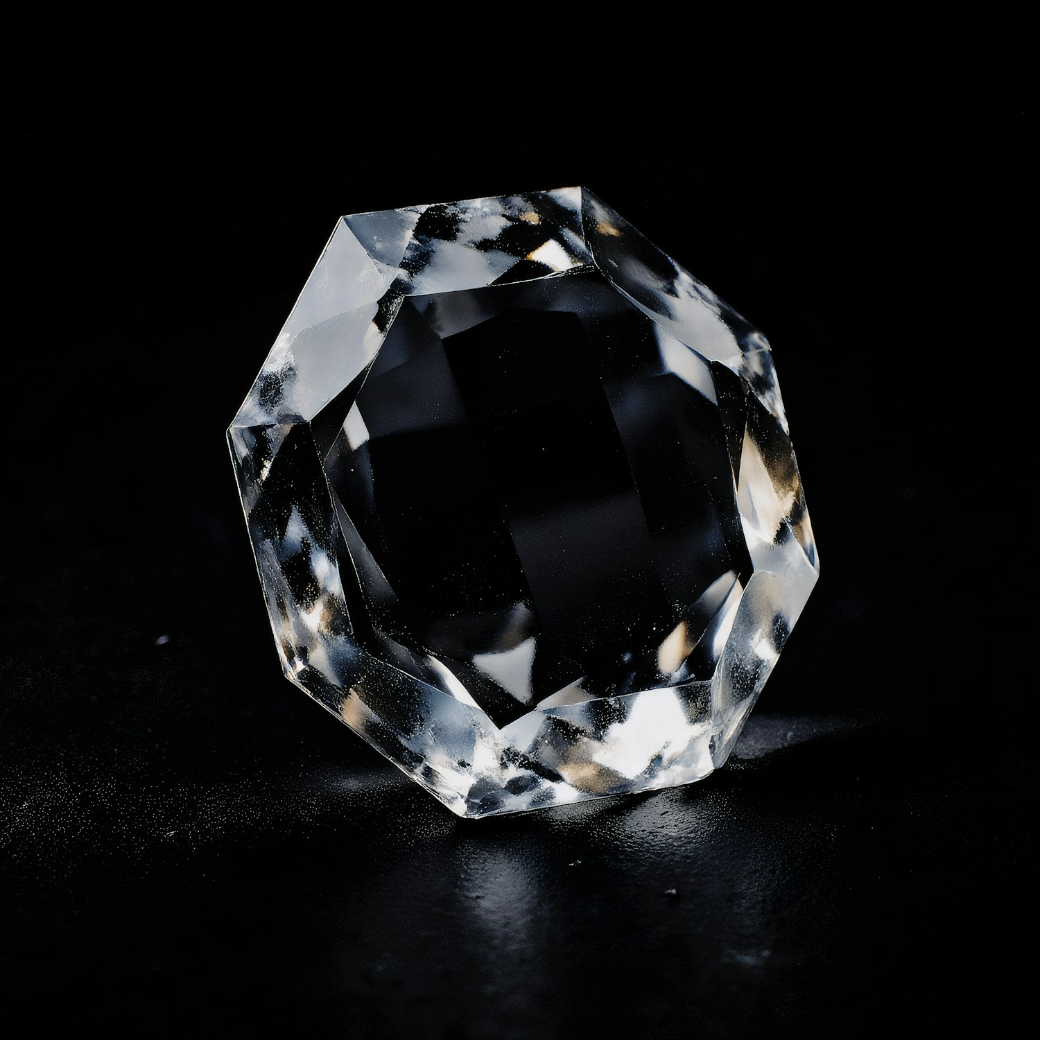 A clear, faceted gemstone on a dark background, showcasing its brilliance and intricate reflections.