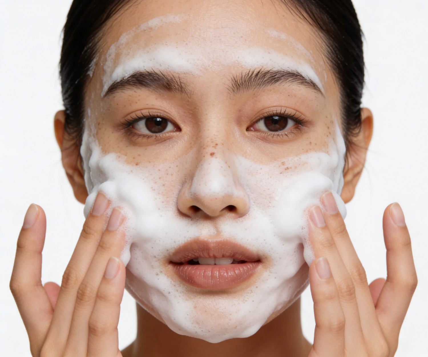Close-up of a person cleansing their face with foaming cleanser, showcasing a skincare routine with a focus on gentle cleansing.