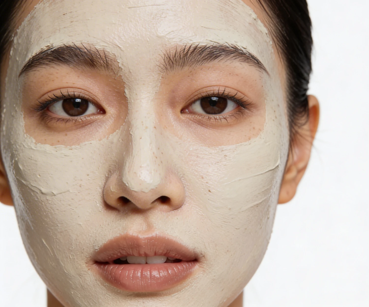 Close-up of a person with a creamy facial mask applied, showcasing smooth skin and a relaxed expression against a plain background.