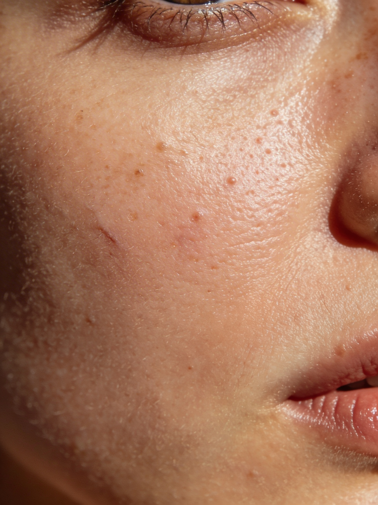 Close-up of facial skin texture, highlighting pores, freckles, and natural features under detailed lighting.