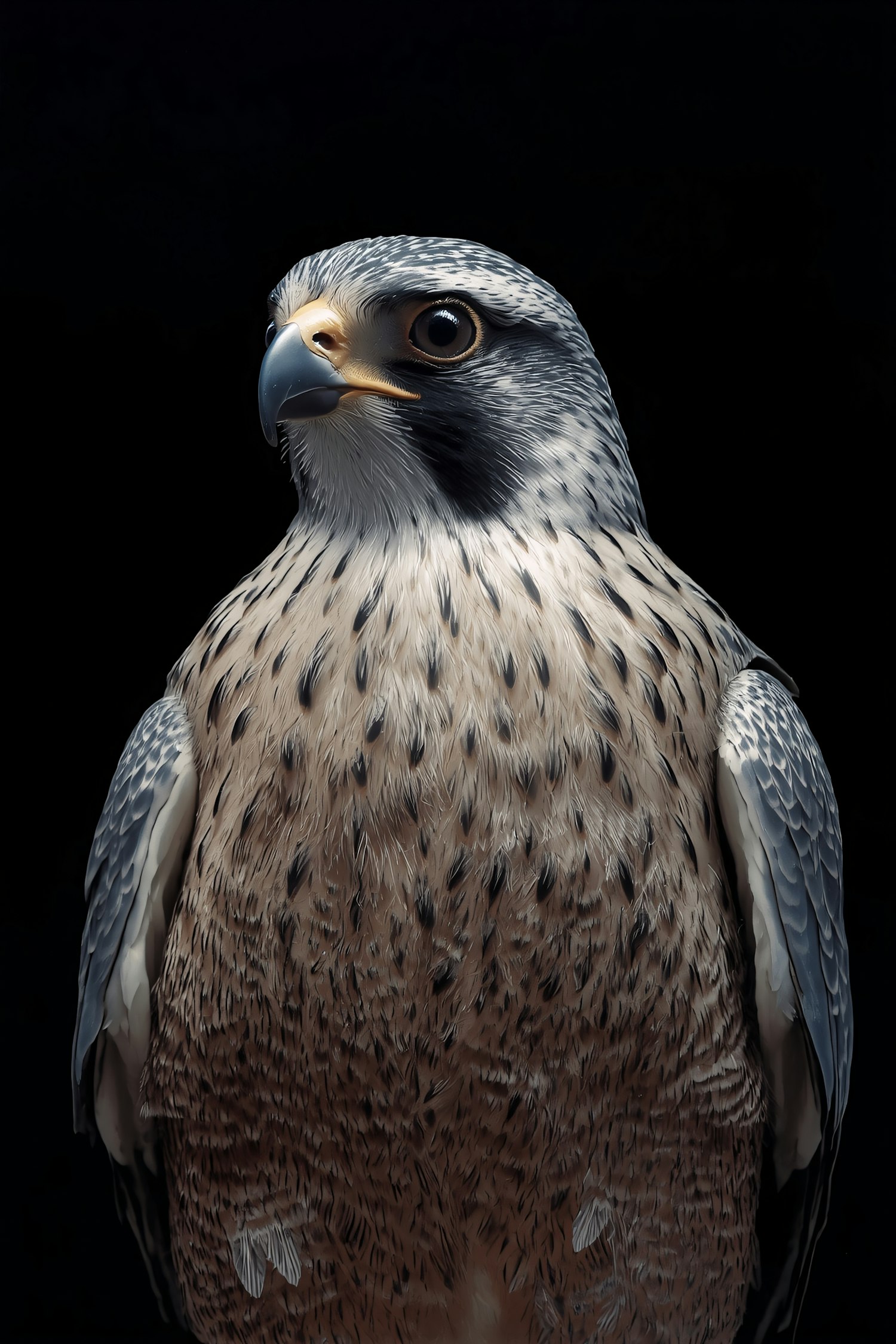 A close-up of a falcon with detailed plumage and a sharp gaze, set against a dark background for a dramatic effect.