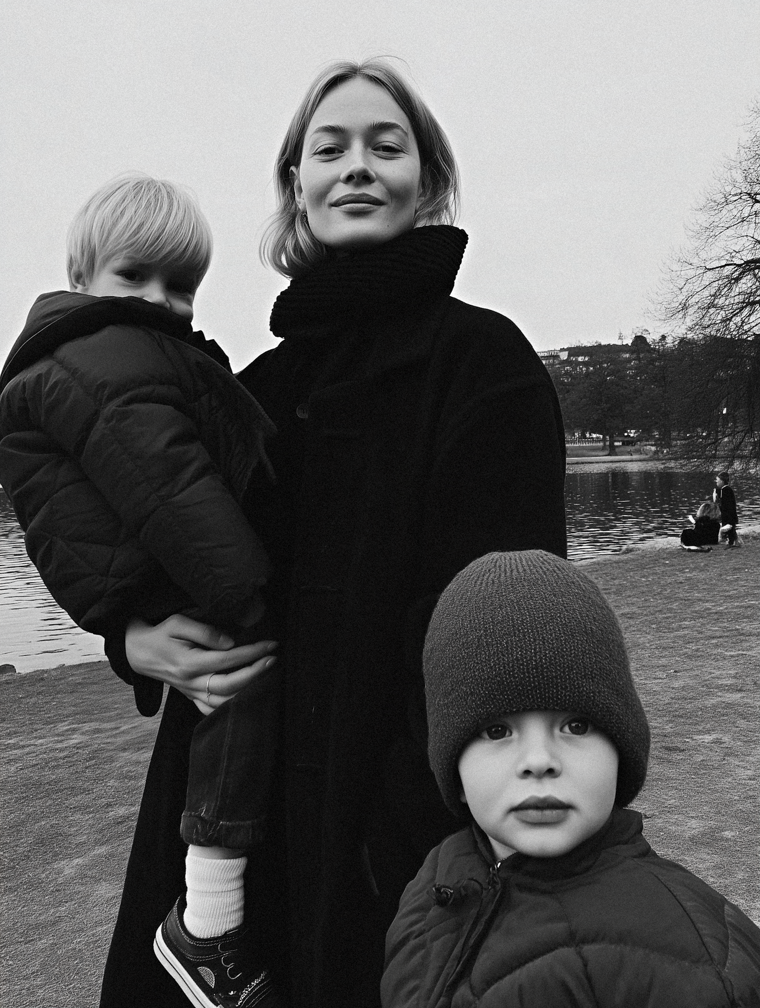 Black-and-white photo of a woman with two children by a lake, capturing a serene and candid family moment outdoors.
