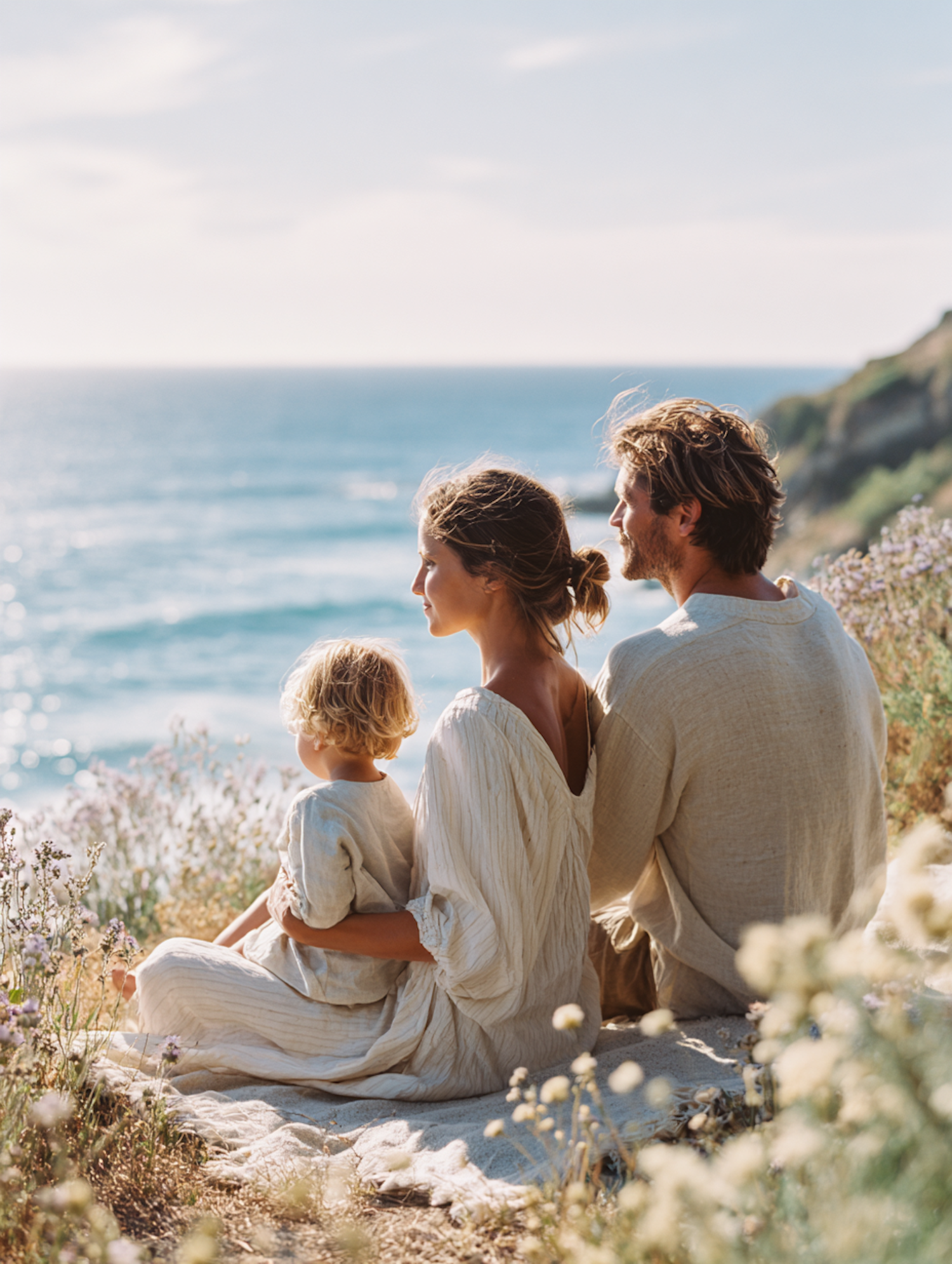 A family enjoys a peaceful moment by the ocean, sitting on a blanket surrounded by wildflowers and overlooking the serene blue waters.